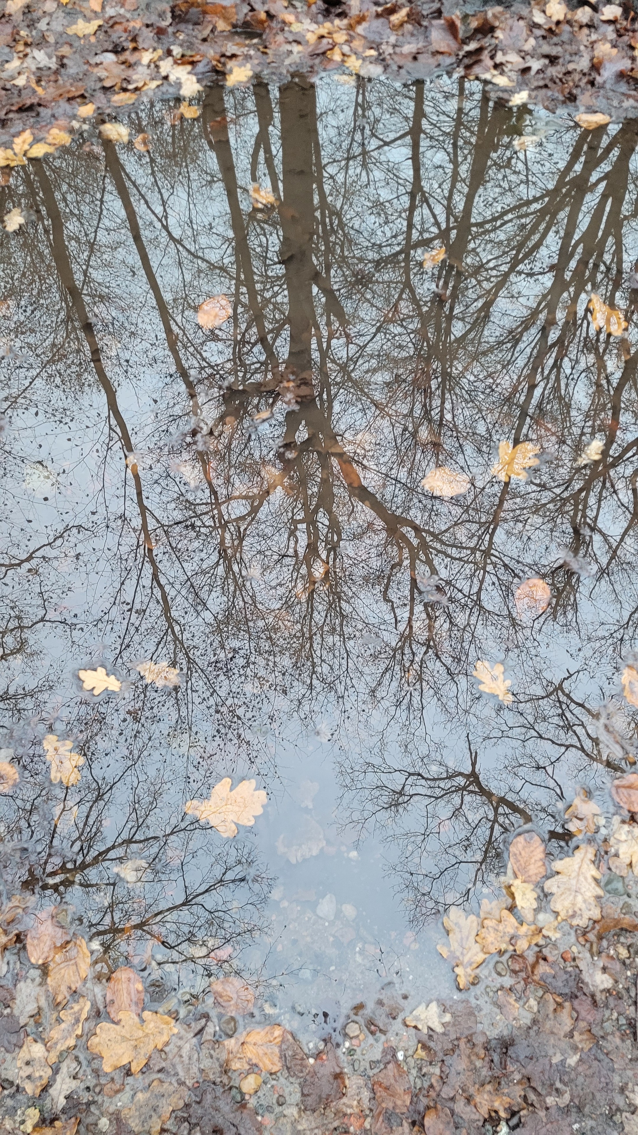 Kahle Bรคume spiegeln sich in einer Pfรผtze im Wald, in der Blรคtter schwimmen.