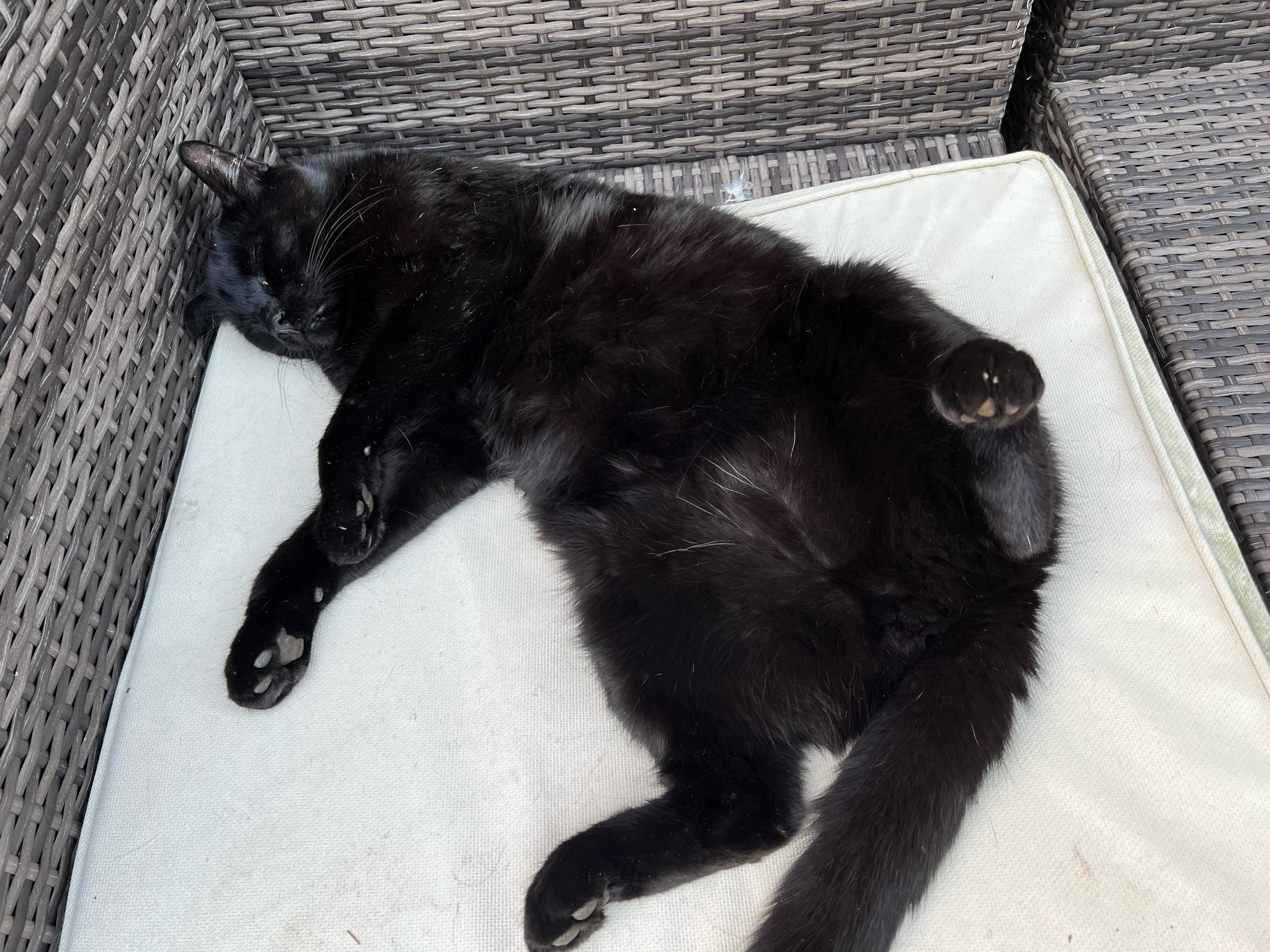 A photo of a black cat snoozing on an off-white seat cushion on a rattan outdoors seat. The cat has his back large spread and his front legs pointing to the left.