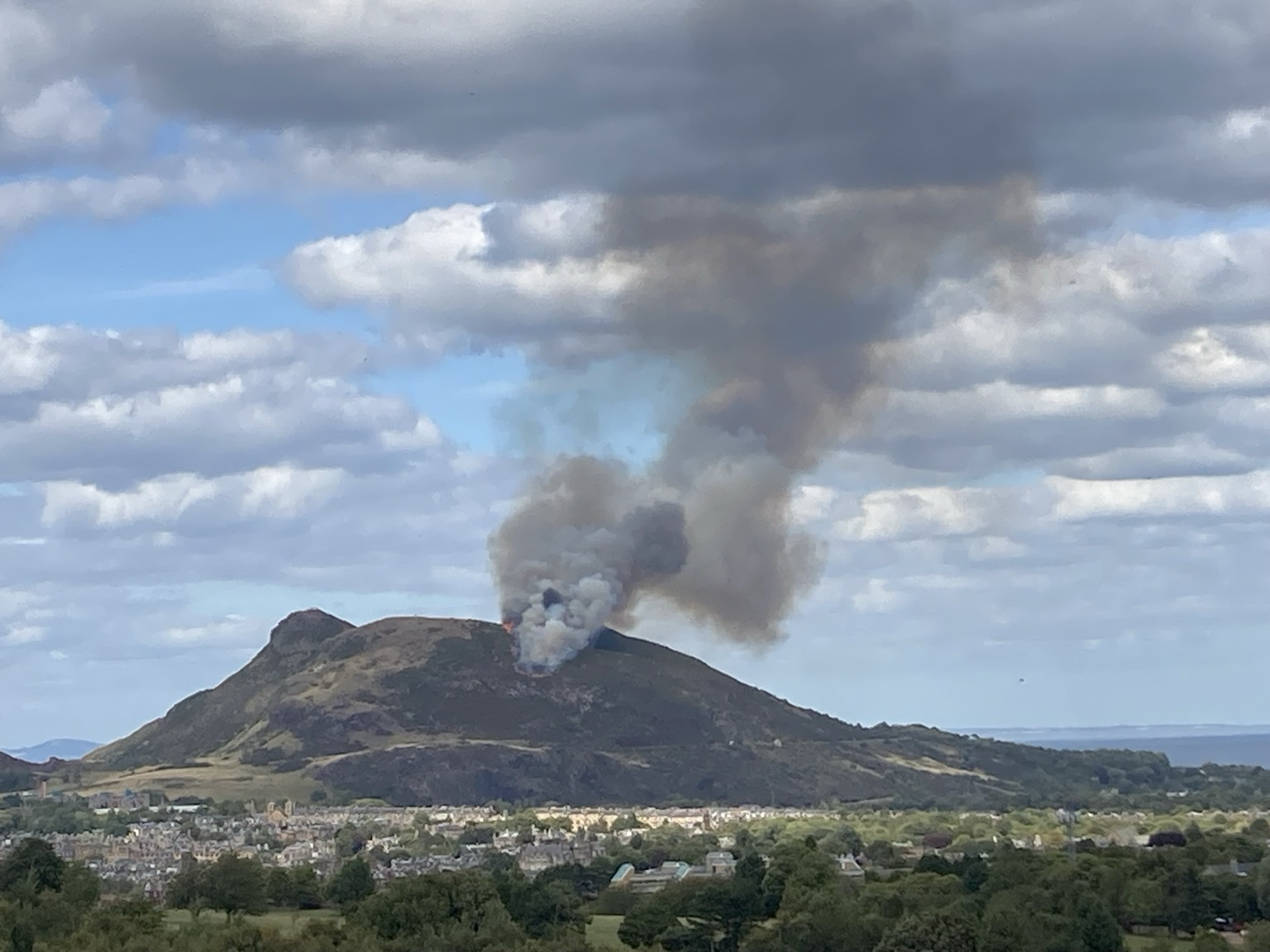 Photo shows hill with plume of dark smoke against a blue sky with fluffy white clouds