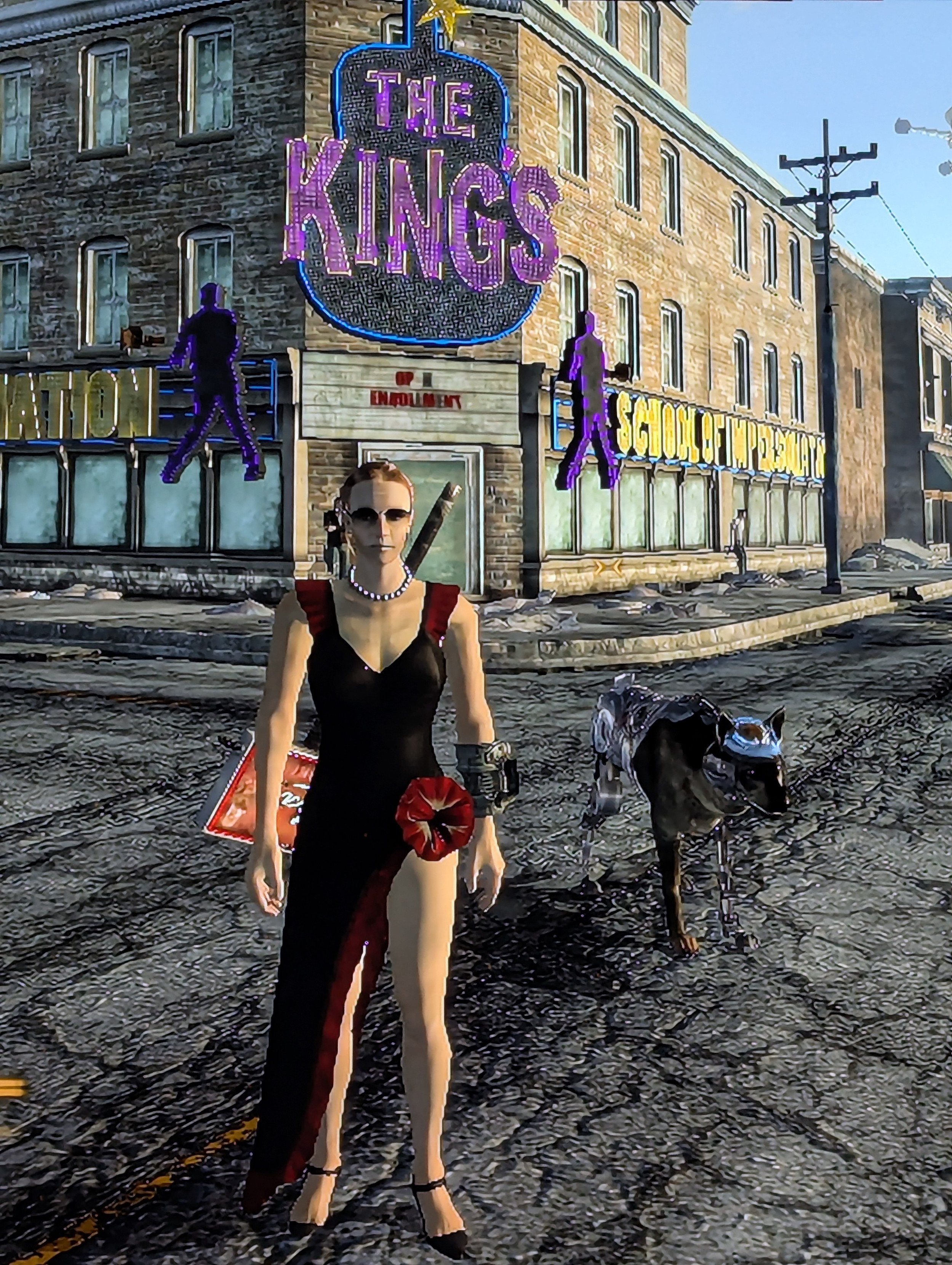 Fallout New Vegas game image of the player character, a white woman in a flamenco dress with a person necklace and aviator shades. She has a store display sign holstered on her back. She has a robot dog with visible brain next to her. They stand in the middle of an intersection in from ofs building with a purple sign that says THE KINGS with silhouettes of Elvis on either side. The street and sidewalks are broken because it's 200 years after the nuclear apocalypse.