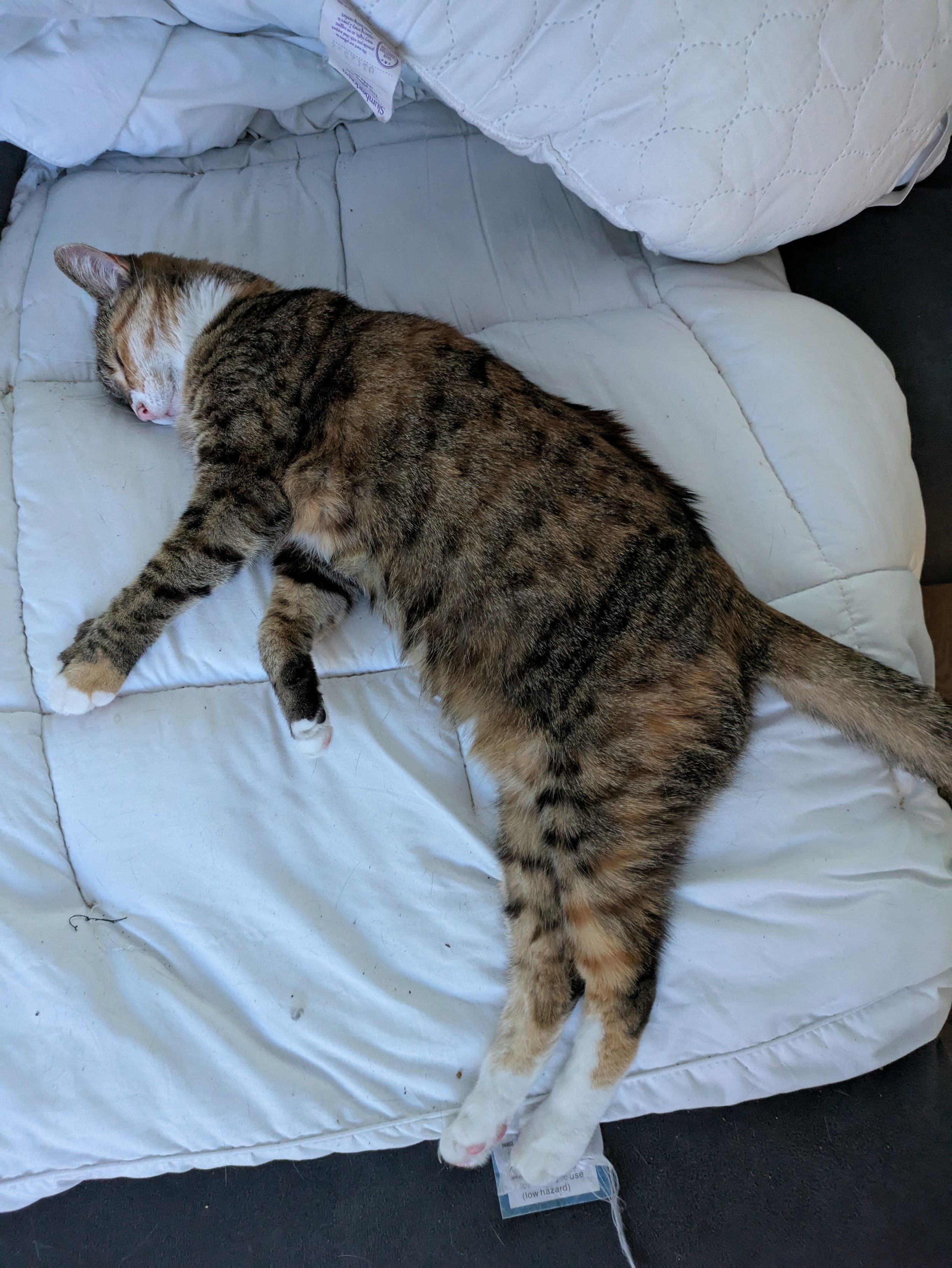 Munch in a "Puma" logo type pose, sleeping. Showing off her light brown, ginger and black colouring. You can also see her white "socks" and chest/chin ruff