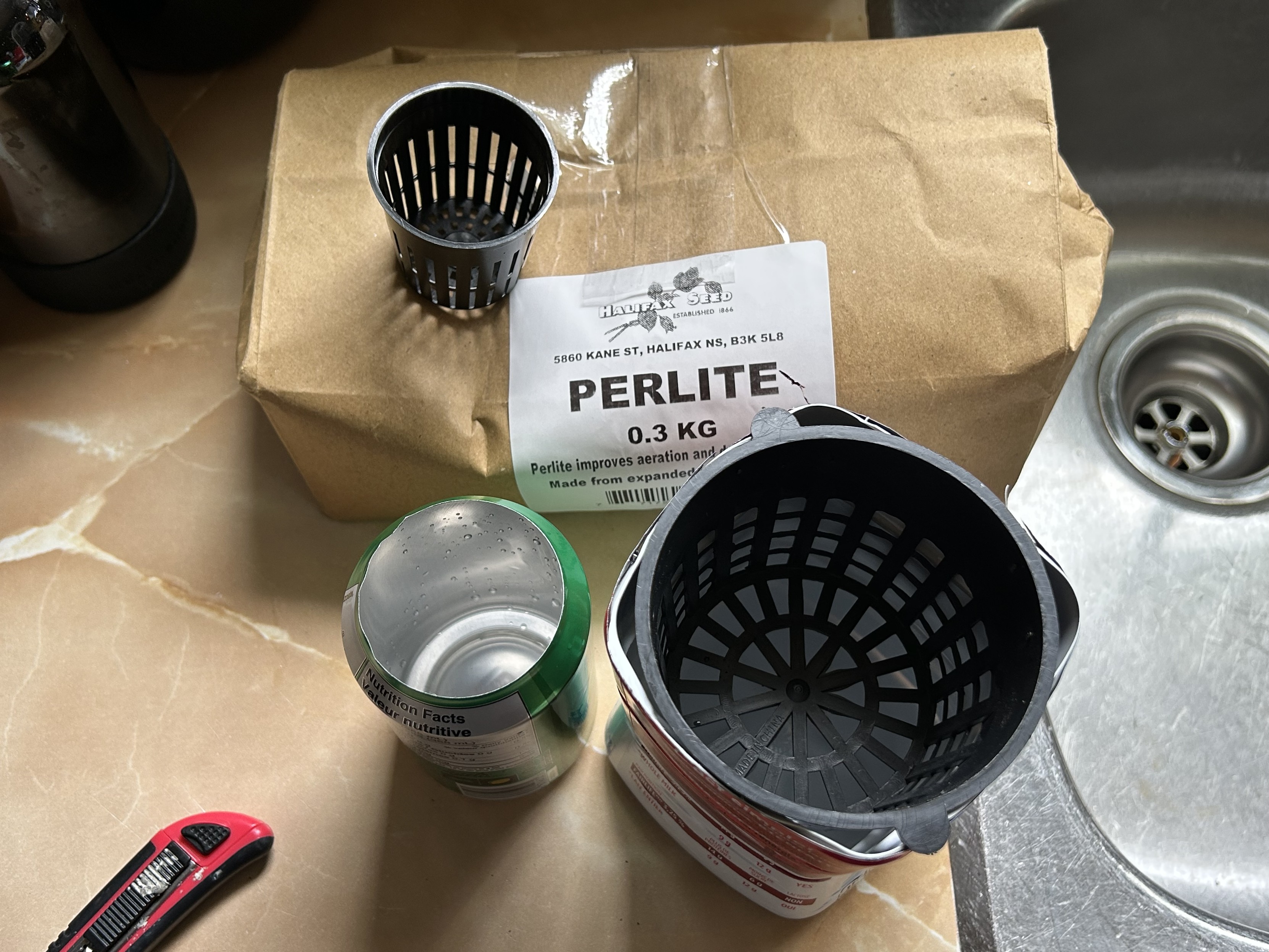 Image of the mesh baskets demonstrating their size, a pop can with the top cut off and a plastic milk carton with its top cut off, and a larger basket sitting neatly in it. A brown paper bag with the label Perlite is sitting beside it.