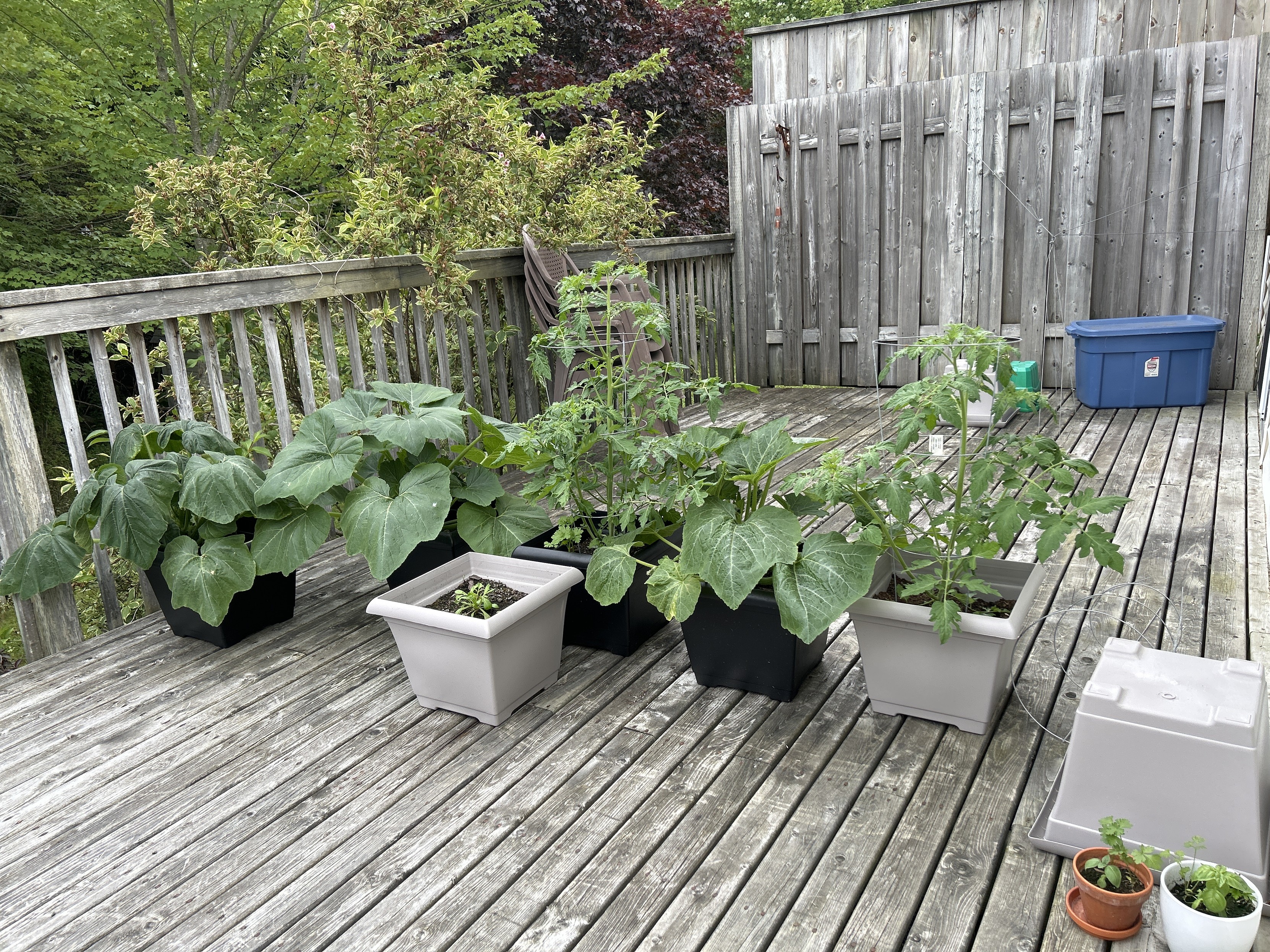Photo of large squash plants and tomato plants in light beige and and black flower containers sitting on a wooden weathered deck.