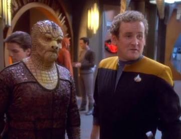 Tosk, an alien from the gamma quadrant, with reptilian features standing next to OβBrien.