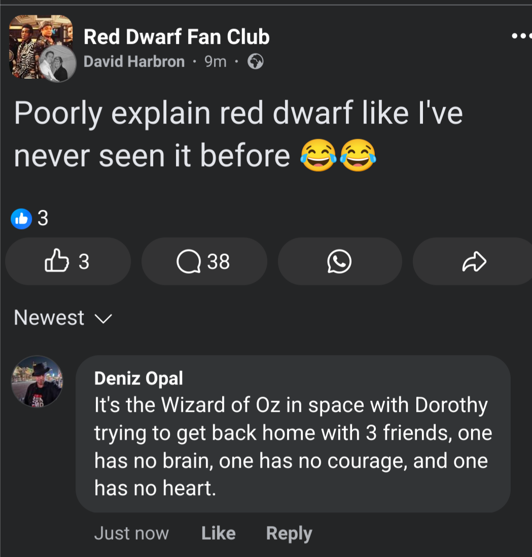 Red Dwarf Fan Club David Harbron. 9m. ... Poorly explain red dwarf like I've never seen it before 3 3 38 Newest Deniz Opal It's the Wizard of Oz in space with Dorothy trying to get back home with 3 friends, one has no brain, one has no courage, and one has no heart.