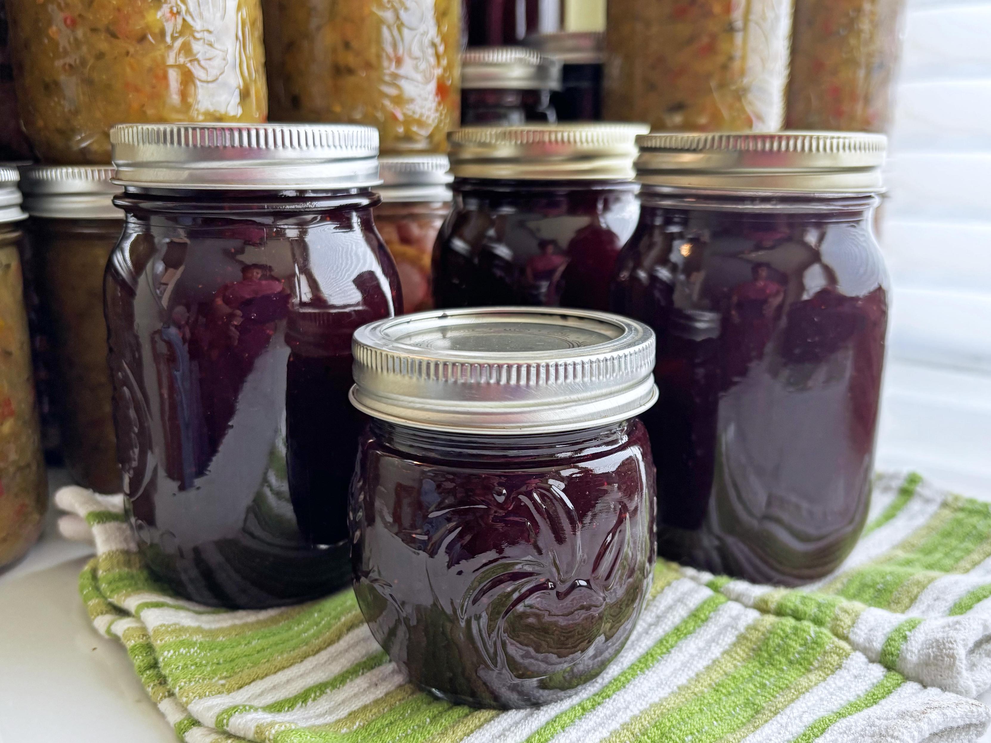3x500ml jars of peachberry jam with 1x250ml jar in front. The colour is a deep maroon-wine colour. Behind the jars are other of this year's preserves (relish, gardinière, strawberry jam), waiting to go into one of the basement pantries.