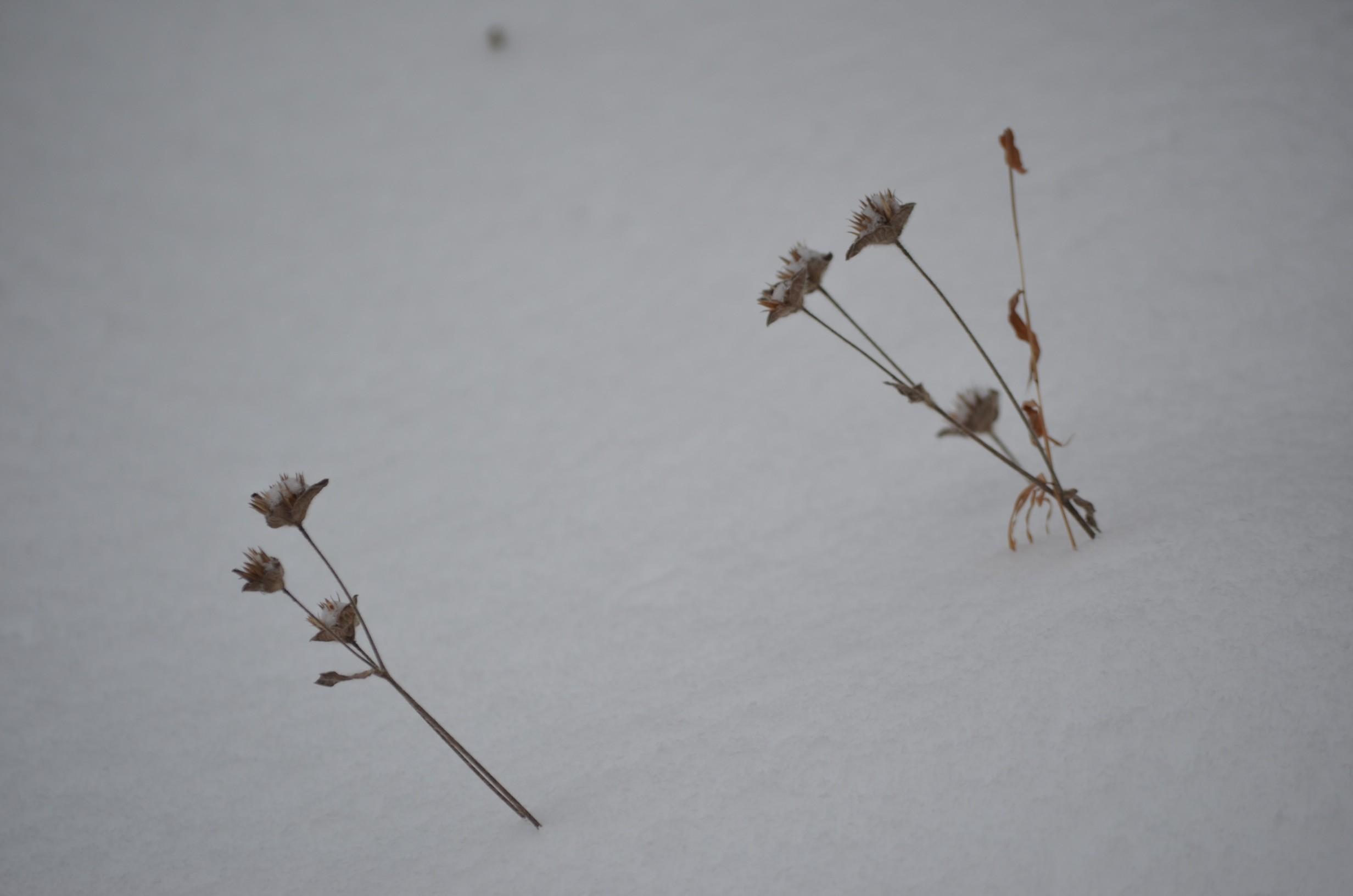 A photo of small dried native plants poking out of snow. Most of the image is the white snow and there are two small plants with dried little flower tops sticking out at an angle as if growing out of a snow drift. It's a fairly stark image.