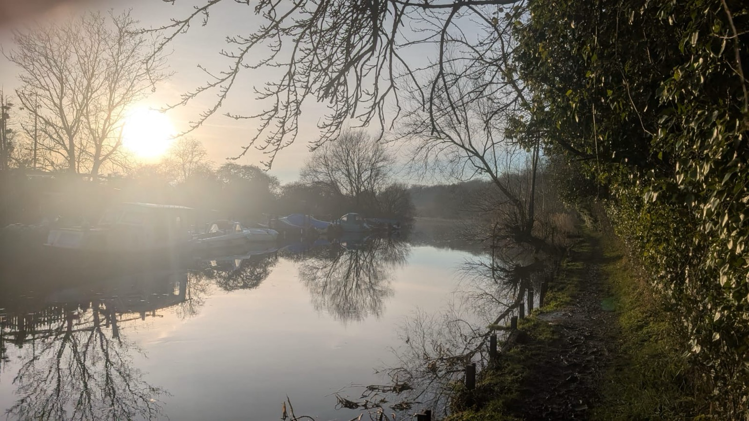 Grove Ferry near Canterbury UK. Sun is just about to set over the river, and the water is as still and reflective as glass. There are river boats moored to the left of the river, and a narrow muddy path winds off into the distance following the edge of the river. The path is walled to the right with trees and hedgerows. Talking of leaning to the right, if Kier Starmer was walking towards you on this narrow riverside path, with no one else in sight, you could definitely push him in. Just saying.