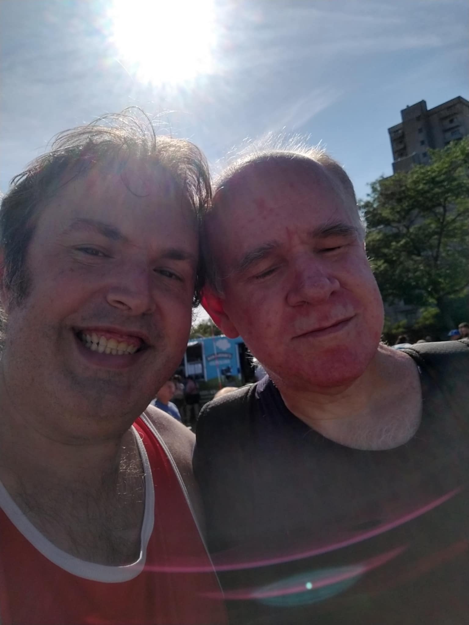 Be My AI: The photo shows two men standing close together, smiling at the camera. The man on the left has short, dark hair and is wearing a red tank top with white trim. The man on the right has short, light hair and is wearing a dark shirt. His eyes are closed, and his face appears slightly flushed. The sun is shining brightly in the background, creating a lens flare effect. There are some trees and a tall building in the distance, suggesting they are outdoors, possibly at an event or gathering.