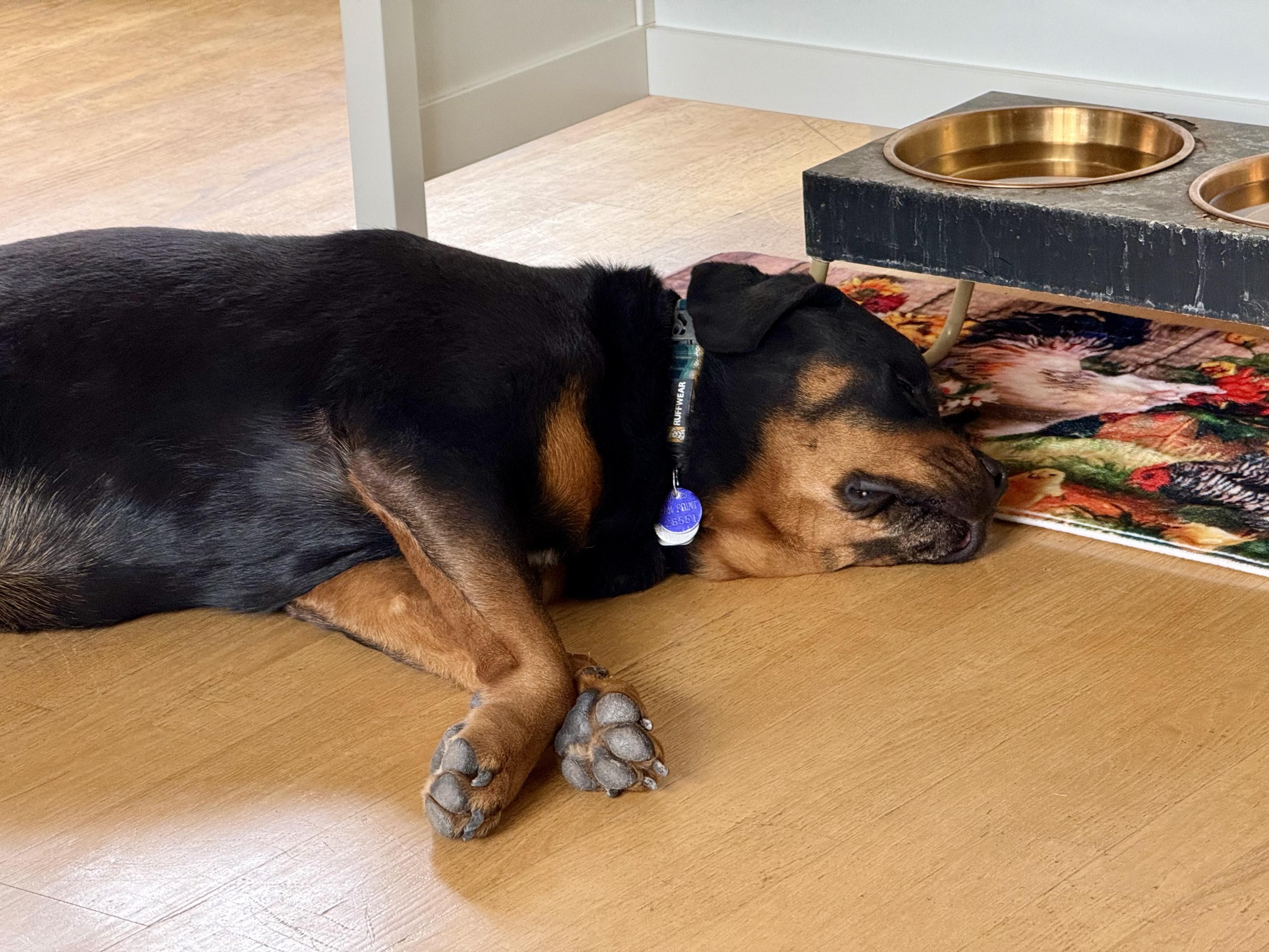 The image shows a black and tan dog lying on a wooden floor next to a raised pet feeding station. The dog is resting its head on a colorful rug with a floral and animal pattern. It has a collar with a blue tag. The feeding station has two bowls, one for food and one for water, both made of brass and set on a black base with metal legs. The dog's body is stretched out, with its front paws extended forward and its head resting on the floor. The background includes a light-colored wall and a portion of a white table leg. Provided by @altbot@fuzzies.wtf, generated privately and locally using Ovis2-8B 🌱 Energy used: 0.146 Wh