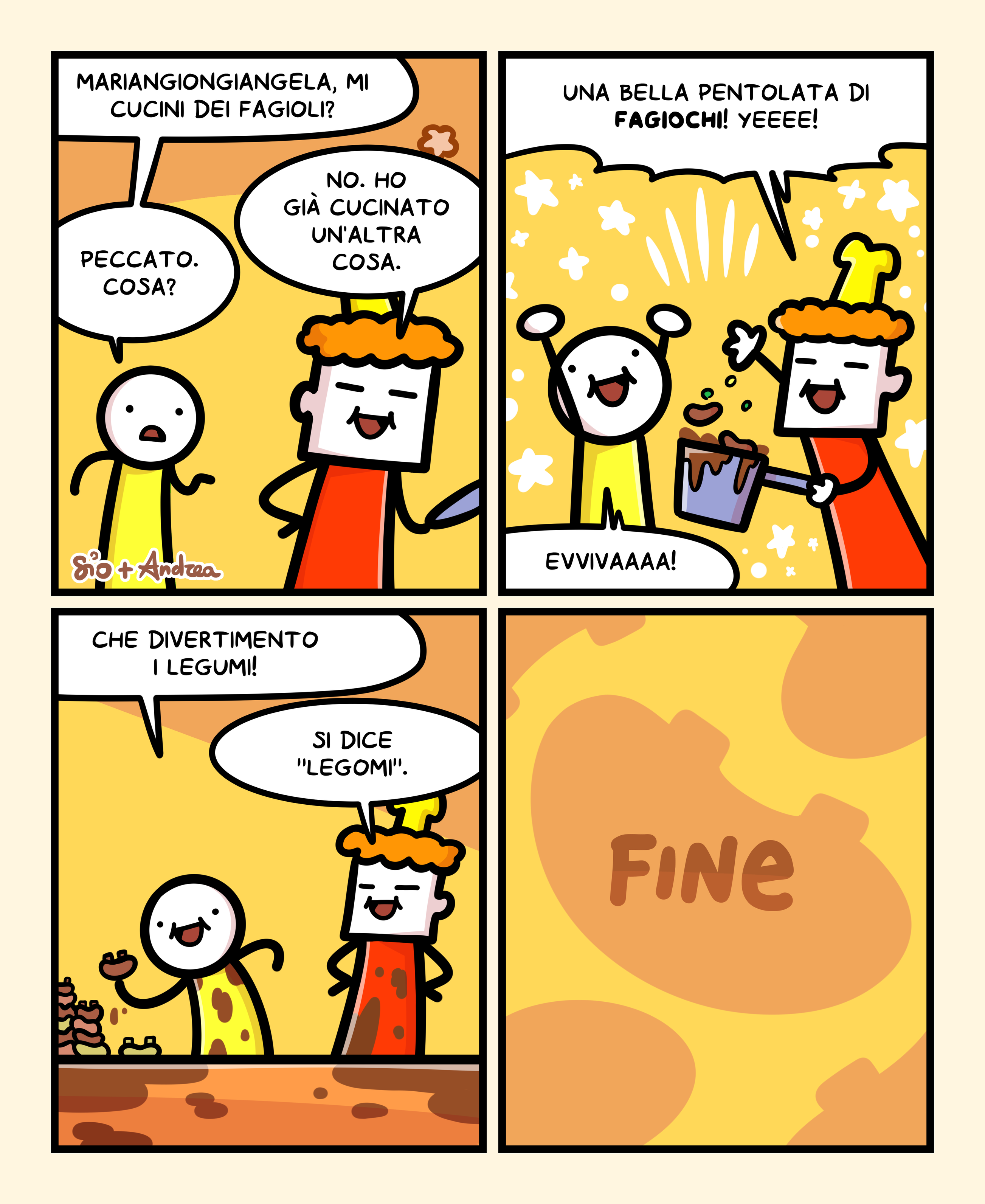 1 Un tizio chiede a Mariangiongiangela: “Mariangiongiangela, mi cucini dei fagioli?” Mariangiongiangela risponde: “No. Ho già cucinato un’altra cosa.” Il tizio risponde un po’ triste: “Peccato. Cosa?” 2 Mariangiongiangela, con una bella pentola piena di in mano, risponde: “Una bella pentolata di fagiochi! Yeeee!” Il tizio esulta: “Evvivaaaa!” 3 Il tizio prende in mano un fagiolo e dice: “Che divertimento i legumi!” Mariangiongiangela precisa: “Si dice “Legomi”. 4 FINE