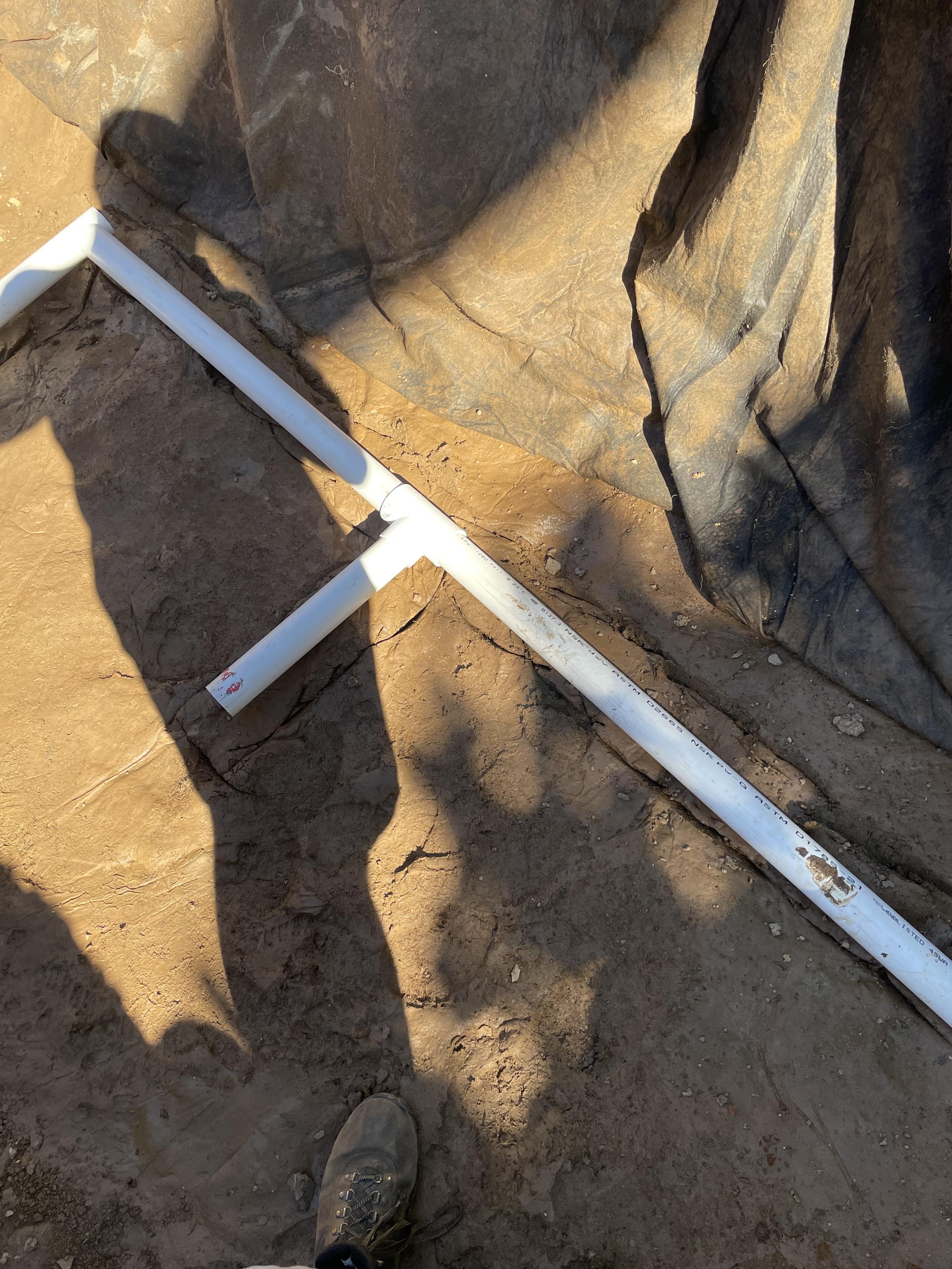 A view of a long stretch of pipe along the edge of a bottom of a pond on top of the dirt. It has a elbow and a short length at the end of the pipe and another in the middle. I have edged along the length of the pipe beginnings of a trench.