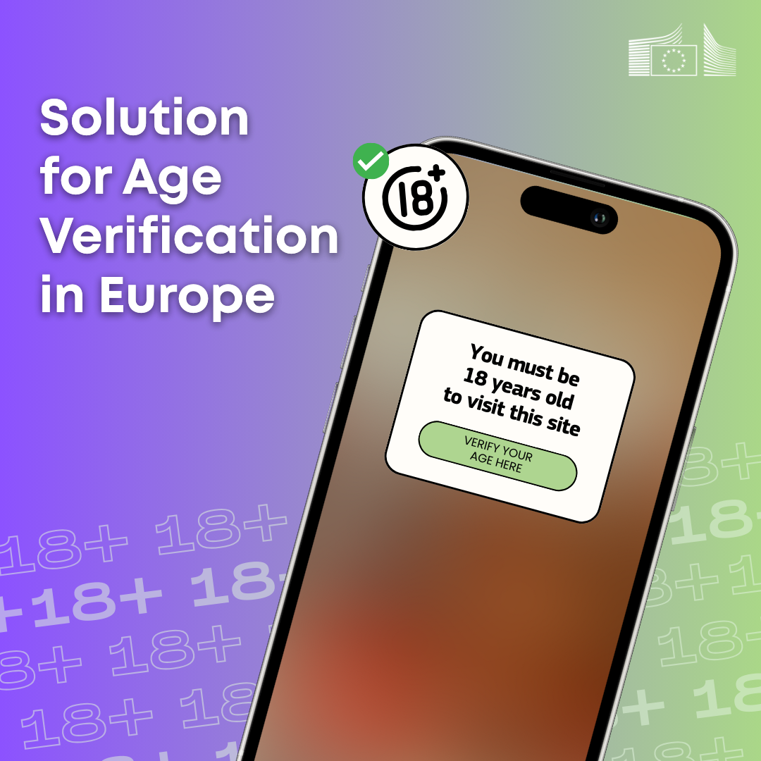 Illustration promoting an age verification solution in Europe. A smartphone screen displays a message requiring users to verify they are 18 years old to access a website. The background is a gradient of purple and green with repeated '18+' symbols. The EU Commission logo appears in the top right corner.