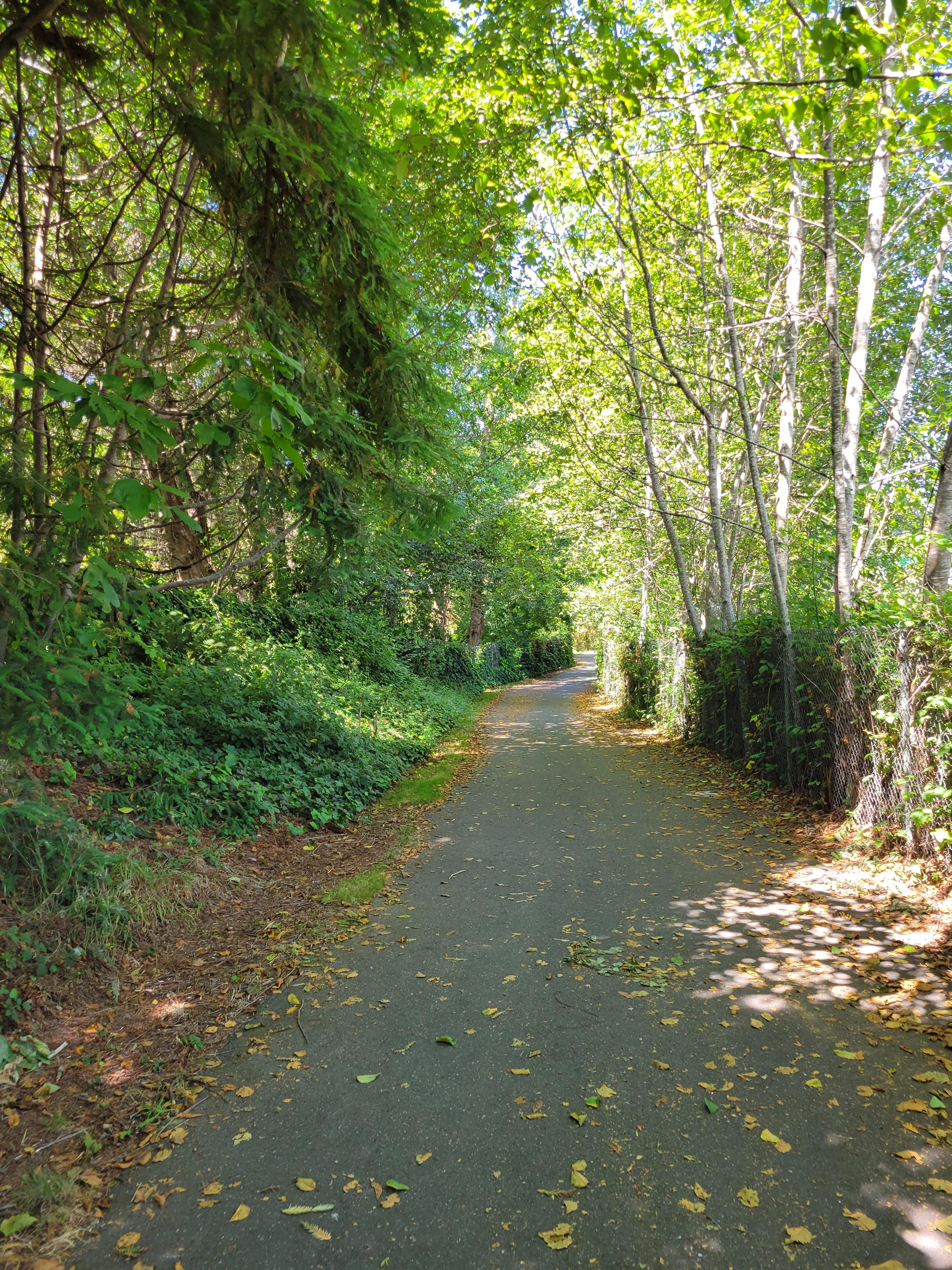 Shady green tunnel with a paved trail running through