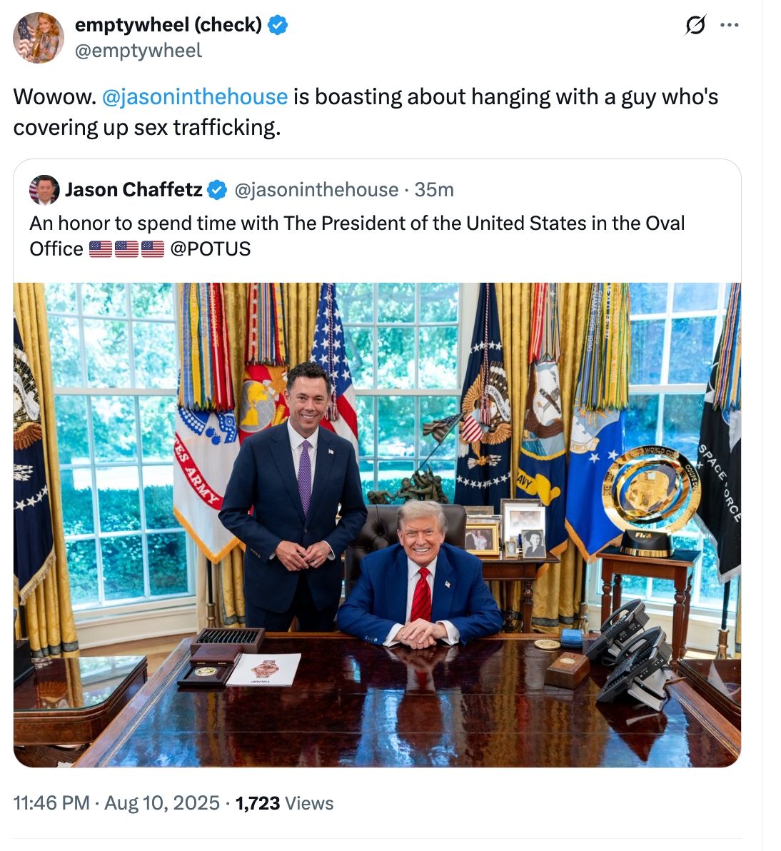 My RT of a post showking Jason Chaffetz posting with Trump. I've added, Wowow. @jasoninthehouse is boasting about hanging with a guy who's covering up sex trafficking.