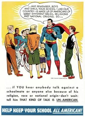 Superman explains to kids that "Your school - like our country - is made up of Americans of many different races, religions, and national origins"