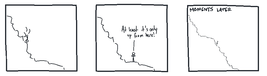 A 3-panel comic. In the first panel is someone tumbling down a large cliff. They manage to stop tumbling and get up by the second panel, saying "At least it's only up from here!" at what looks like the base of the cliff. The third panel is captioned "Moments later". They seem to be tumbling farther down the now seemingly infinite cliff.