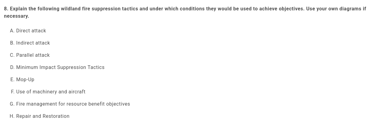 8. Explain the following wildland fire suppression tactics and under which conditions they would be used to achieve objectives. Use your own diagrams if necessary. Direct attack Indirect attack Parallel attack Minimum Impact Suppression Tactics Mop-Up Use of machinery and aircraft Fire management for resource benefit objectives Repair and Restoration