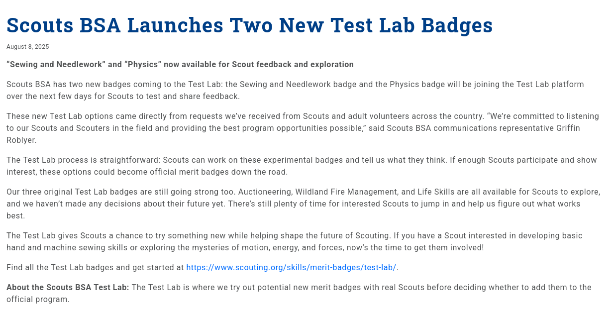 Scouts BSA Launches Two New Test Lab Badges August 8, 2025 “Sewing and Needlework” and “Physics” now available for Scout feedback and exploration Scouts BSA has two new badges coming to the Test Lab: the Sewing and Needlework badge and the Physics badge will be joining the Test Lab platform over the next few days for Scouts to test and share feedback. These new Test Lab options came directly from requests we’ve received from Scouts and adult volunteers across the country. “We’re committed to listening to our Scouts and Scouters in the field and providing the best program opportunities possible,” said Scouts BSA communications representative Griffin Roblyer. The Test Lab process is straightforward: Scouts can work on these experimental badges and tell us what they think. If enough Scouts participate and show interest, these options could become official merit badges down the road. Our three original Test Lab badges are still going strong too. Auctioneering, Wildland Fire Management, and Life Skills are all available for Scouts to explore, and we haven’t made any decisions about their future yet. There’s still plenty of time for interested Scouts to jump in and help us figure out what works best. The Test Lab gives Scouts a chance to try something new while helping shape the future of Scouting. If you have a Scout interested in