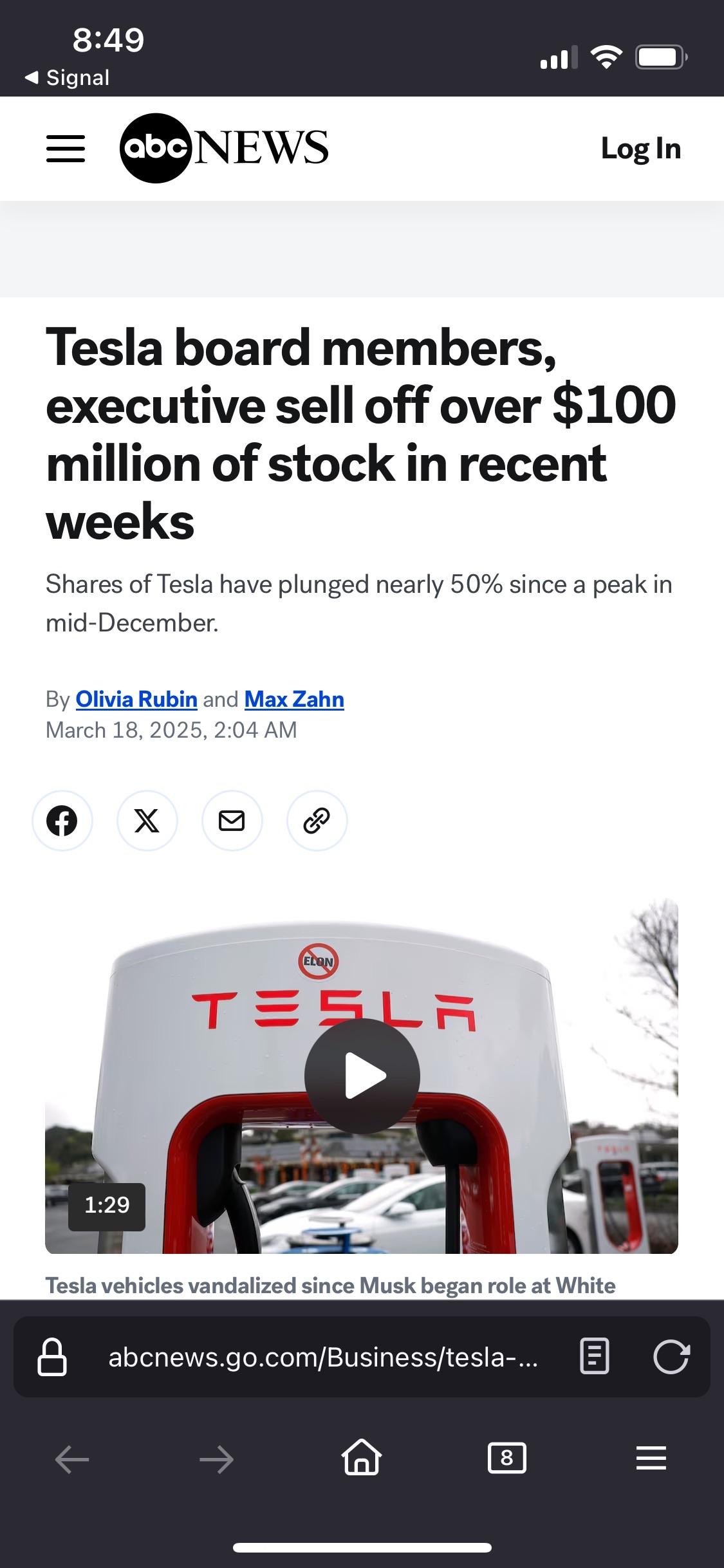 The image displays a mobile screen showing an ABC News article about Tesla board members and executives selling over $100 million of stock. The headline is prominently featured, along with a play button for a video regarding vandalism of Tesla vehicles.
