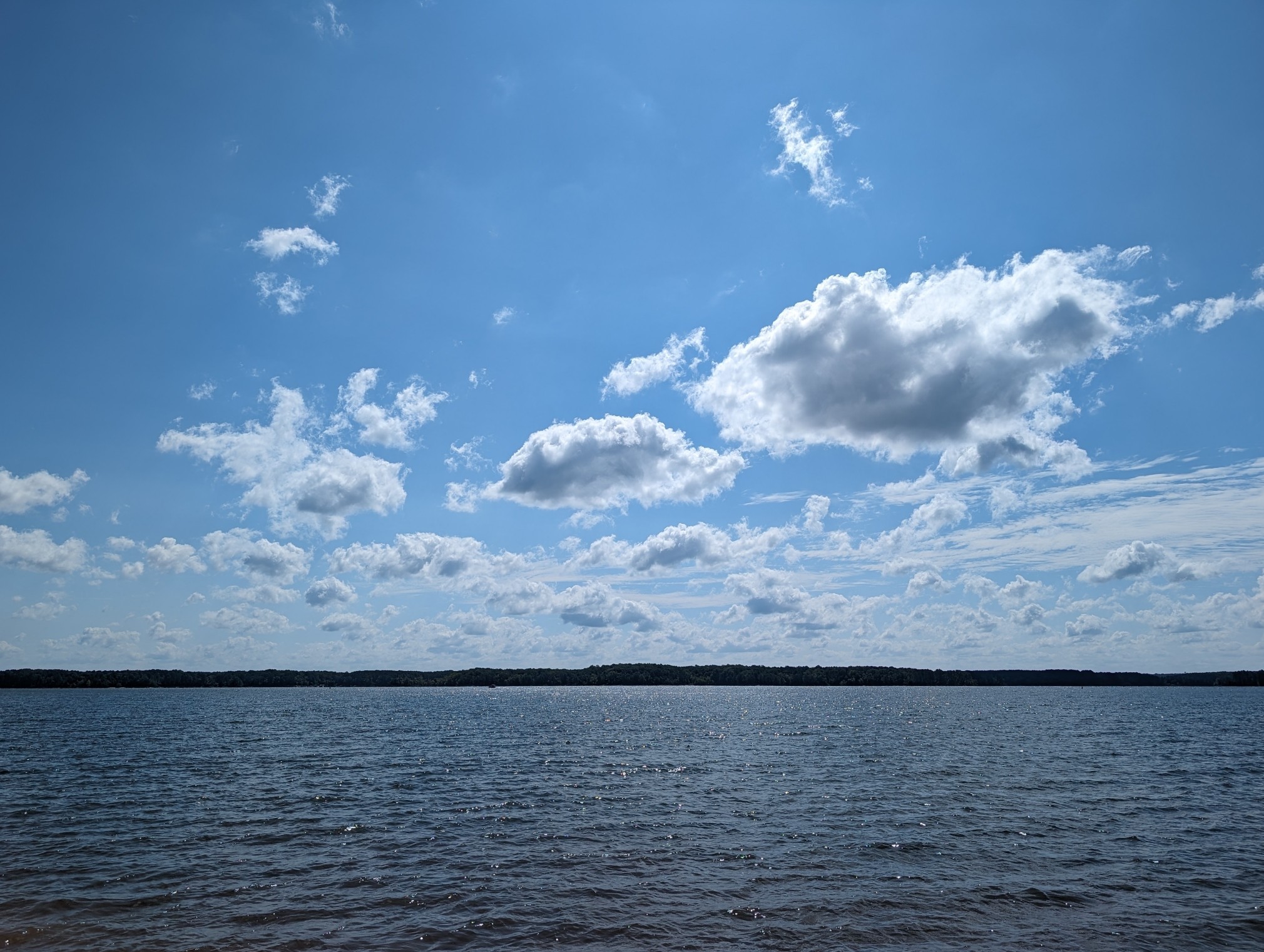 fluffy white clouds in a blue sky over a sparkling lake - Kerr Lake State Recreation Area, Henderson, NC