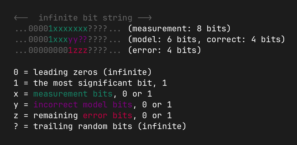 Text-only visualization of the concept with monospace font. It compares three numbers: 1. original measurement (8 bits significand accuracy), 2. the output of a fitted model (6 bits significand of which 4 first bits match the measurement), 3. the error (4 bits significand), i.e. the difference of the model and the measurement, or the part of the measurement that is unexplained by the model Full text content: <-- infinite bit string --> ...00001xxxxxxx????... (measurement: 8 bits) ...00001xxxyy??????... (model: 6 bits, correct: 4 bits) ...000000001zzz????... (error: 4 bits) 0 = leading zeros (infinite) 1 = the most significant bit, 1 x = measurement bits, 0 or 1 y = incorrect model bits, 0 or 1 z = remaining error bits, 0 or 1 ? = trailing random bits (infinite)