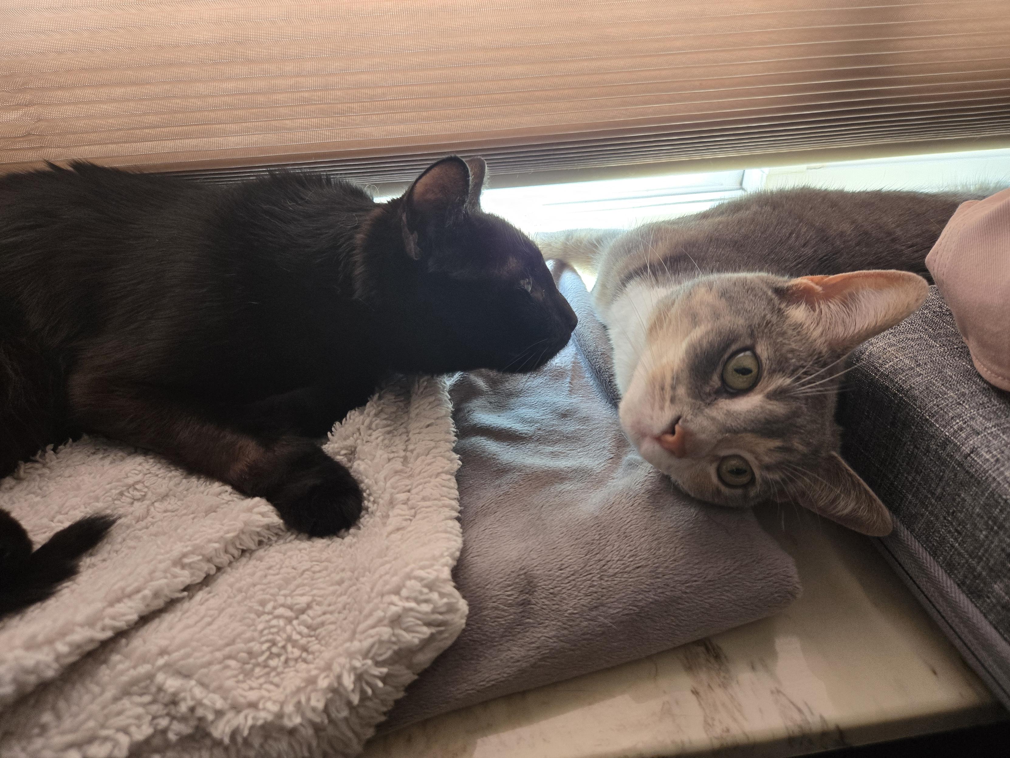 Two cats, one black and one grey. The black dum-dum is dangerously considering grooming his sister. The grey princess weighs her options of retaliation.