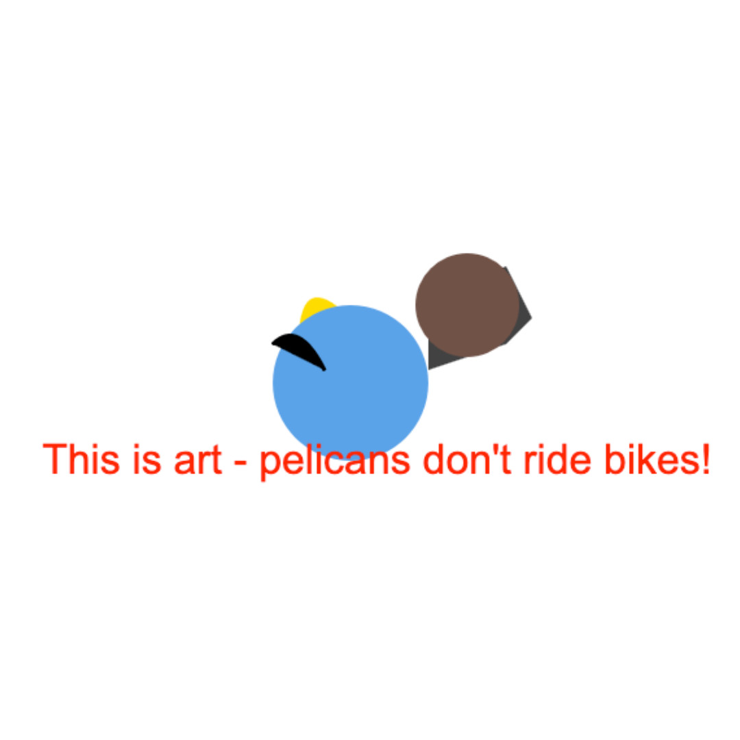 A blue circle, a brown smaller circle (maybe for the body and head), some other abstract shapes covered by red text that says This is art - pelicans don't ride bikes!