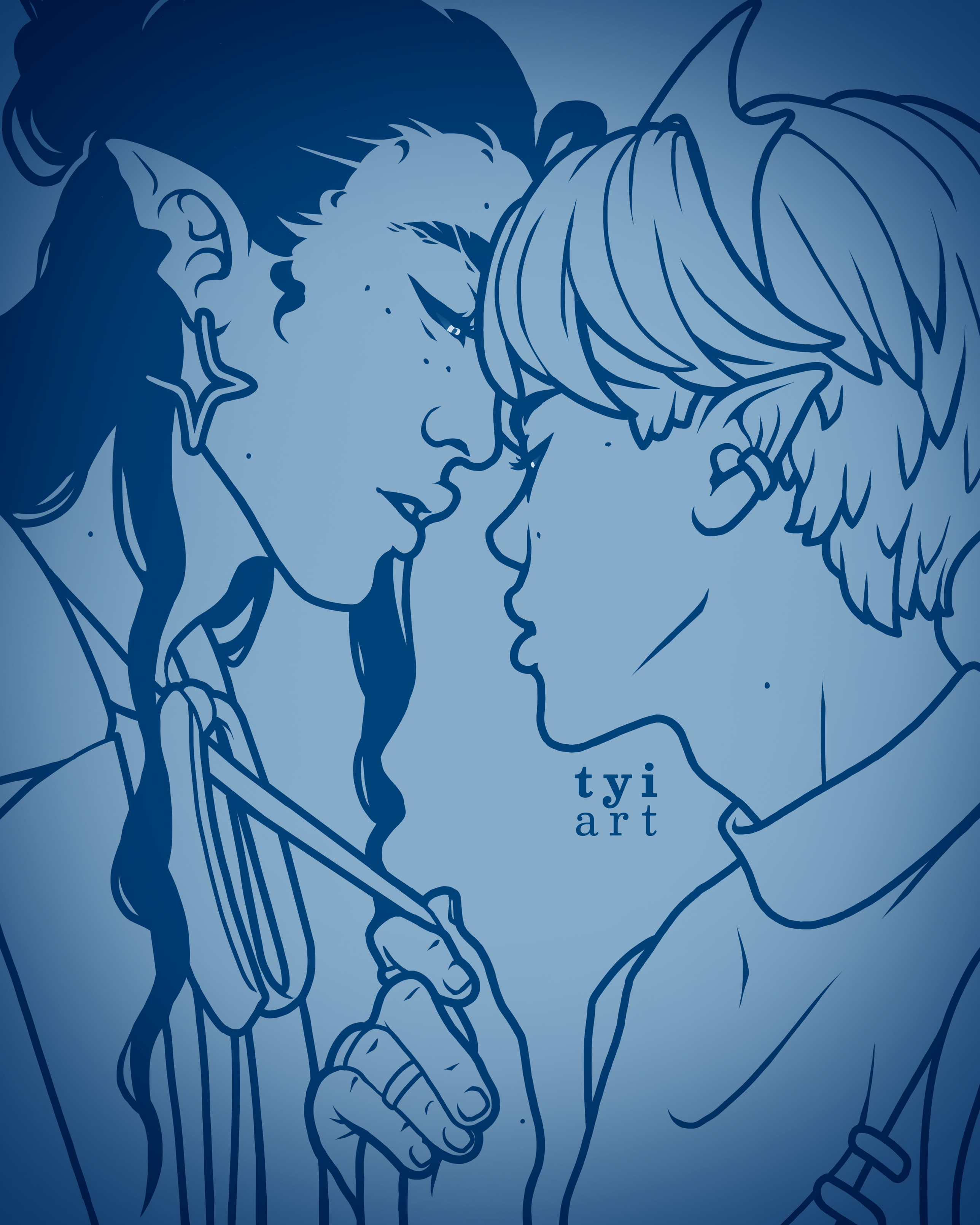 Lineart drawing of two men leaning towards each other as the shorter one - Ethan - pulls onto the ribbon that the taller one - Isaiah - is wearing around his neck.