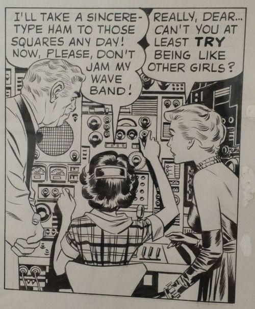 Cartoon art, black-and-white with intricate linework: An older man in a fancy rich people party jacket stands on the left, with a somewhat younger (trophy wife?) woman in an evening gown, fancy necklace, and those satin gloves that go all the way up her arms. They are standing over a young woman (girl?) wearing a tartan-pattern blouse with a big floppy collar and loose sleeves, who is sitting in front of a bunch stereotypical old-school radio equipment, replete with knobs, dials, and meters. She is actively twiddling some knobs, facing the equipment and not really paying close attention to the older folks. The seated girl says "I'll take a sincere-type ham to those squares any day! Now, please, don't jam my wave band!" To which the woman replies "Really, dear... can't you at least TRY being like other girls?"