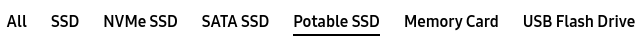 Screenshot of part of https://www.samsung.com/uk/memory-storage/portable-ssd/ The options "All", "SSD", "NVMe SSD", "SATA SSD", "Potable SSD", "Memory Card", and "USB Flash Drive" are displayed, with "Potable SSD" underlined.