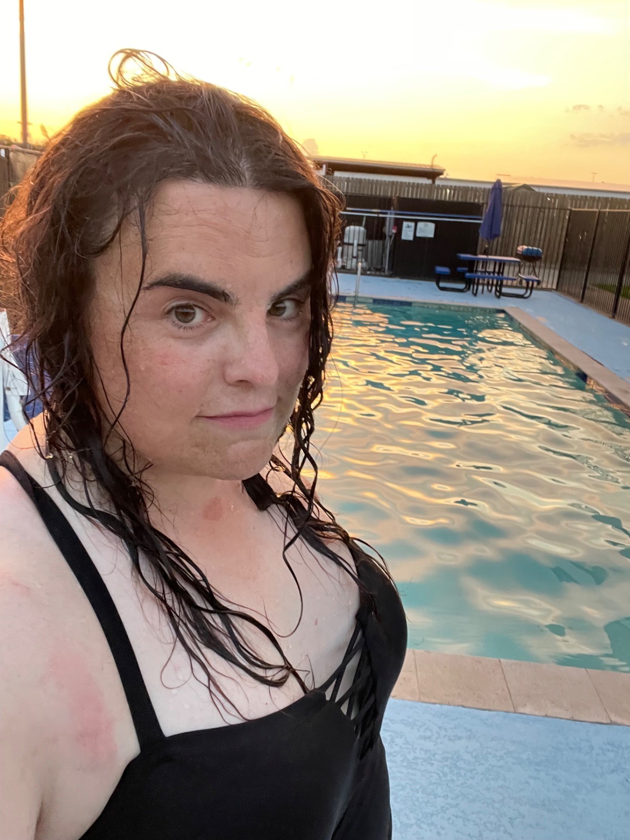 A woman with long black hair, standing in front of a pool, with a twilight sky in the background.