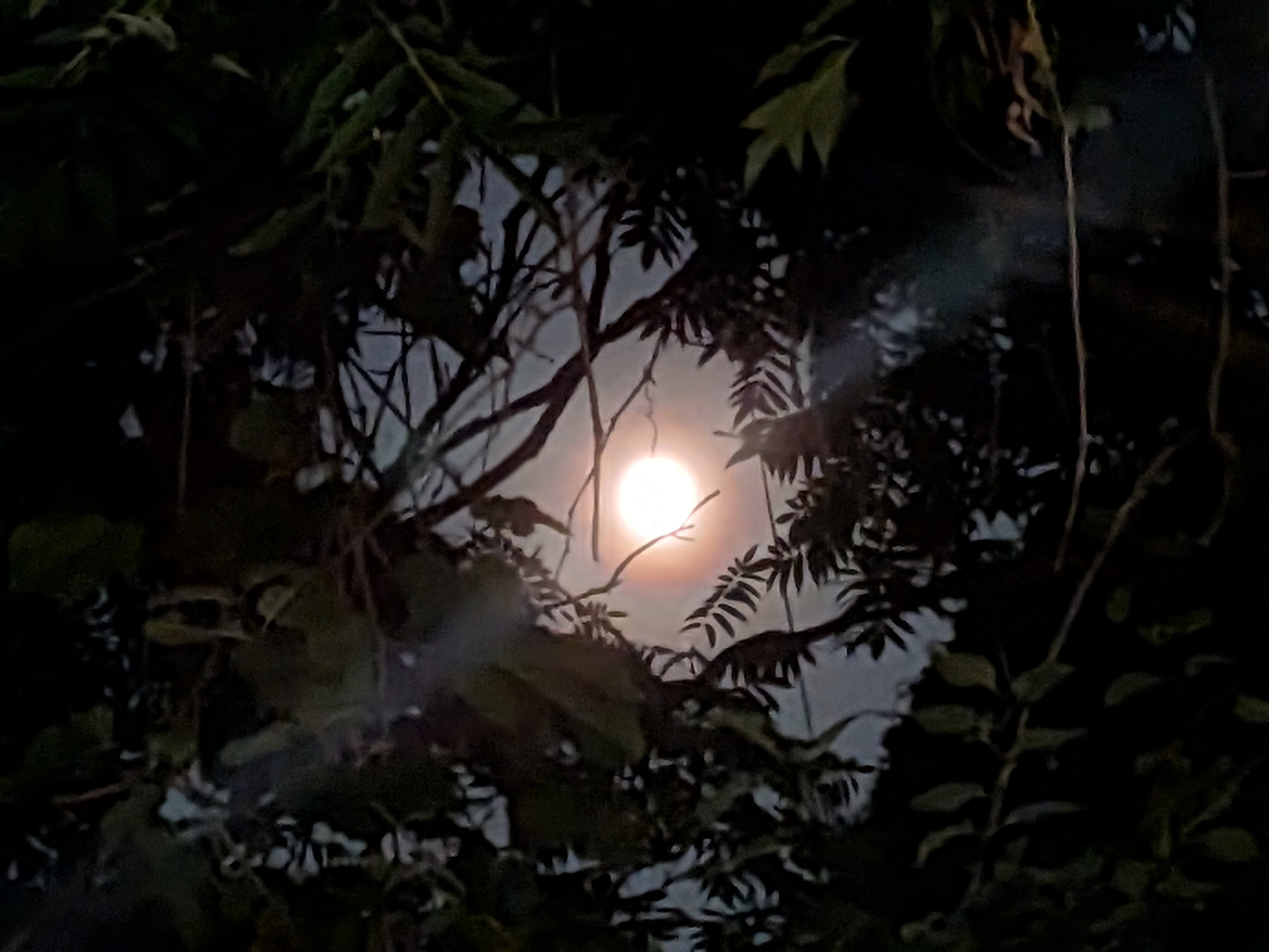 The moon surrounded by tree leaves and branches.