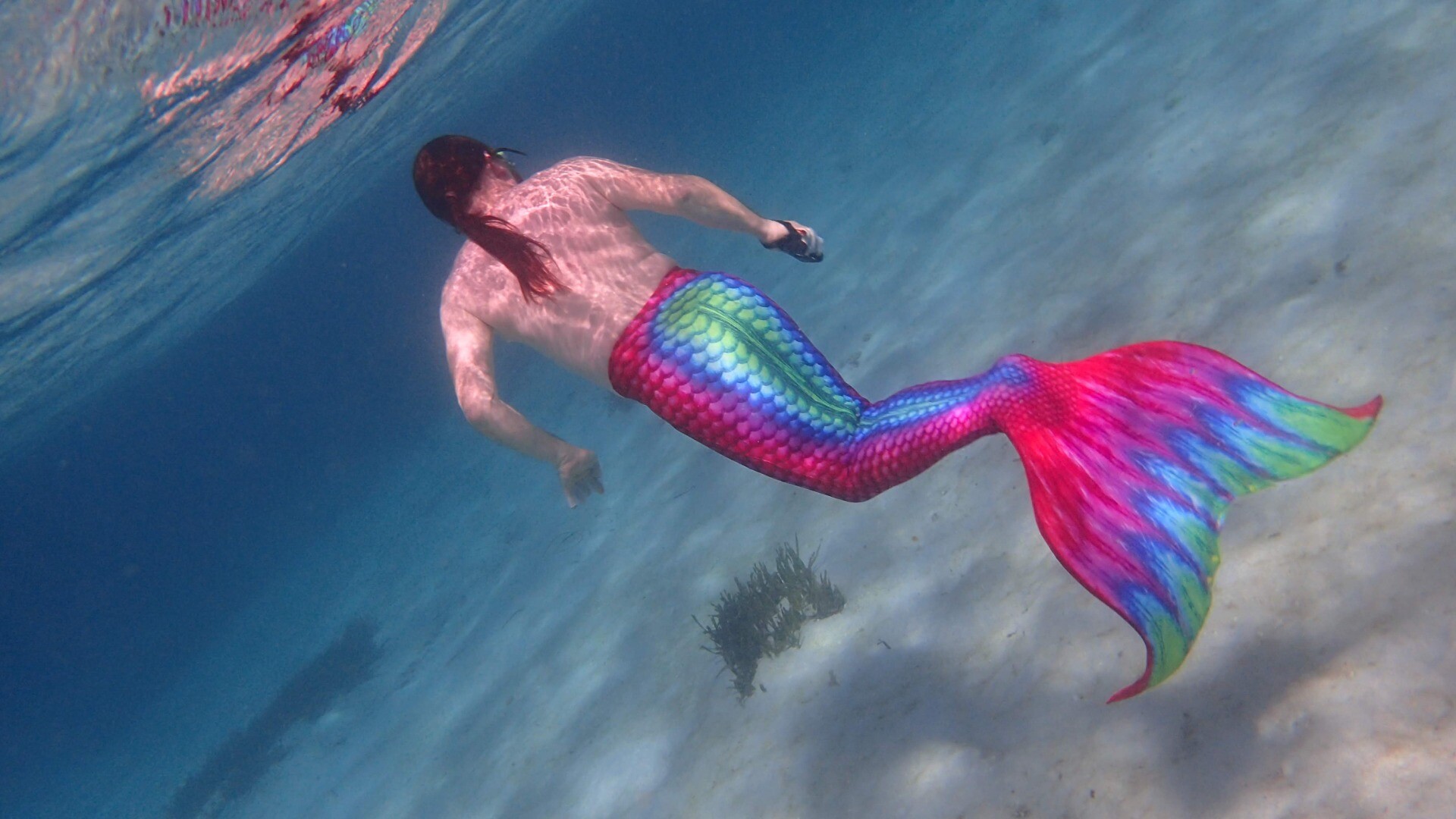 A merman with red hair swimming away. He has a red, blue, and green lower body and tail, and is swimming above a sandy sea floor.