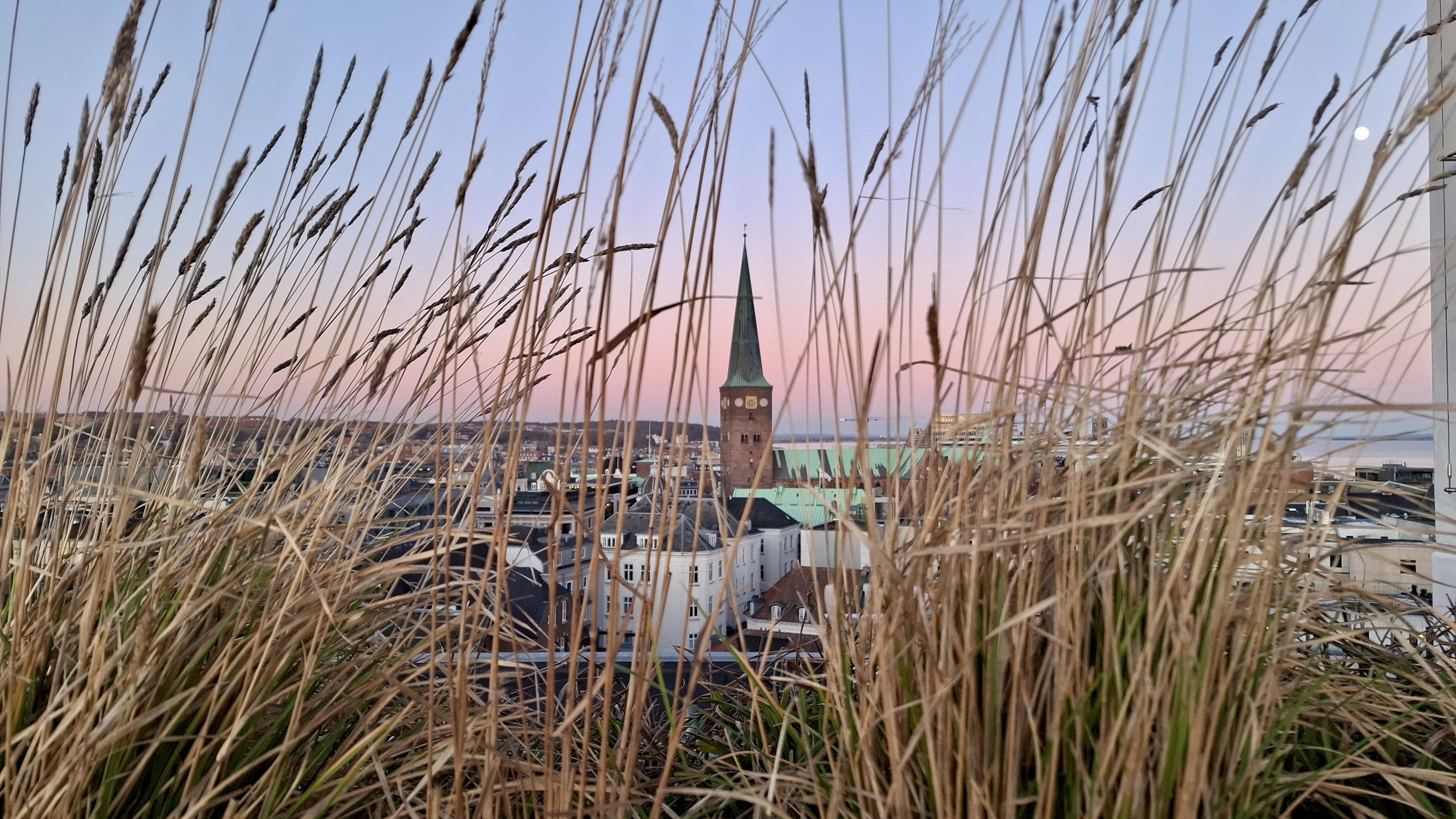 Short version: Aarhus Cathedral spire in aerial view seen through long grasses. Fuller description: Aerial view across Aarhus mid-city to the sea, seen through long grasses, their stems bending in the wind. This is the café garden on the rooftop of Salling department store, 30 metres up. Framed through the long-stemmed grass stalks: Domkirken, the cathedral spire. The sky is cloudless and a light bluey-purple colour with a streak of sunset pink. The moon is unusually bright and clear, high in the sky.