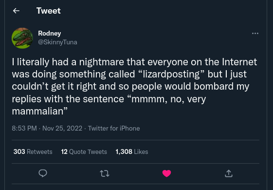 Screenshot of a tweet by user @Skinnytuna that reads: I literally had a nightmare that everyone on the Internet was doing something called “lizardposting” but | just couldn’t get it right and so people would bombard my replies with the sentence “mmmm, no, very mammalian”