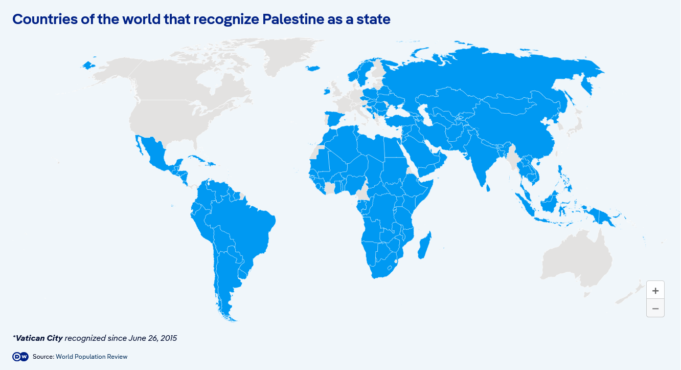 A map of the world. Countries that recognise the state of Palestine are shown in blue. Most of the map is blue.