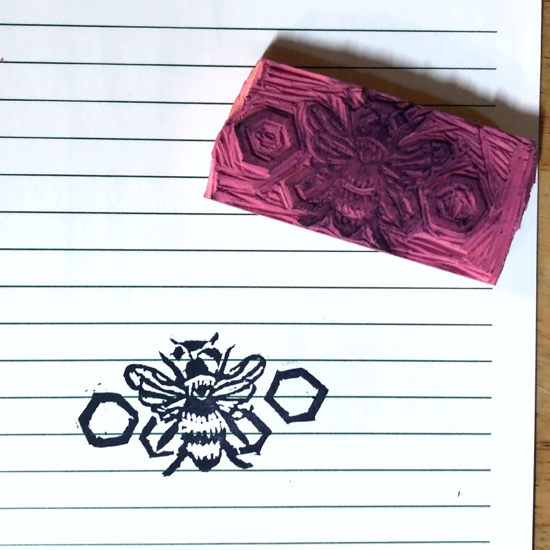 A photo of a piece of note paper with an image stamped on it and the hand carved eraser stamp placed above it, image side up. The image is a top down view of a fuzzy bumblebee with wings outstretched superimposed on three nested hexagons with one more on either side