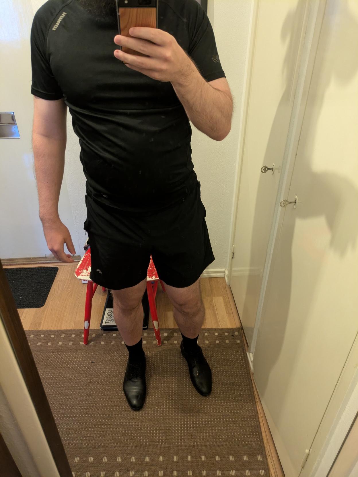 Tööttääjä urheiluvaatteissa ja keinonahkakengissä.