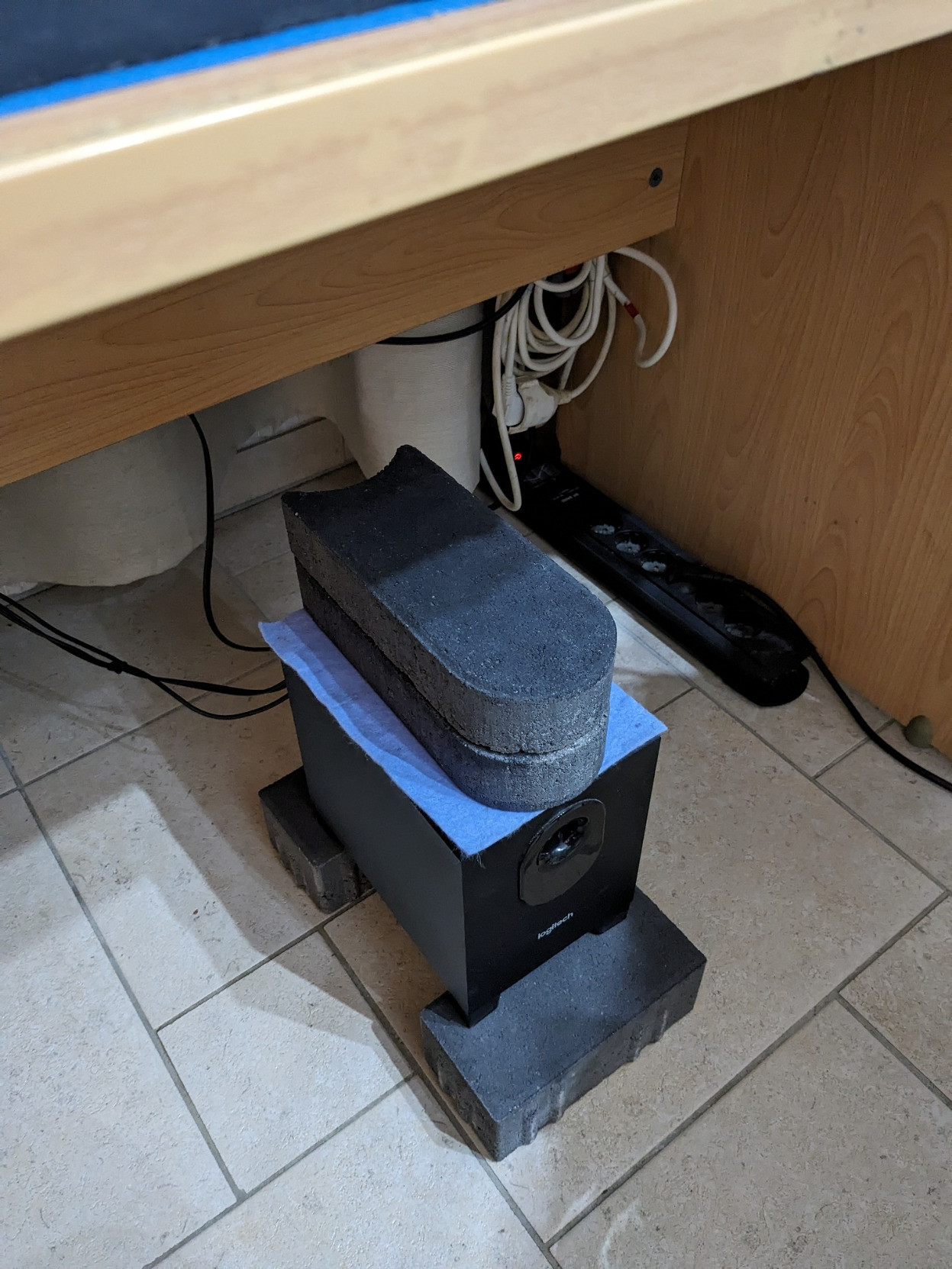 The Logitech subwoofer of this speaker set placed under my desk, with some bricks under it to raise it, and with two other bricks on top to better immobilize it from its own vibrations.