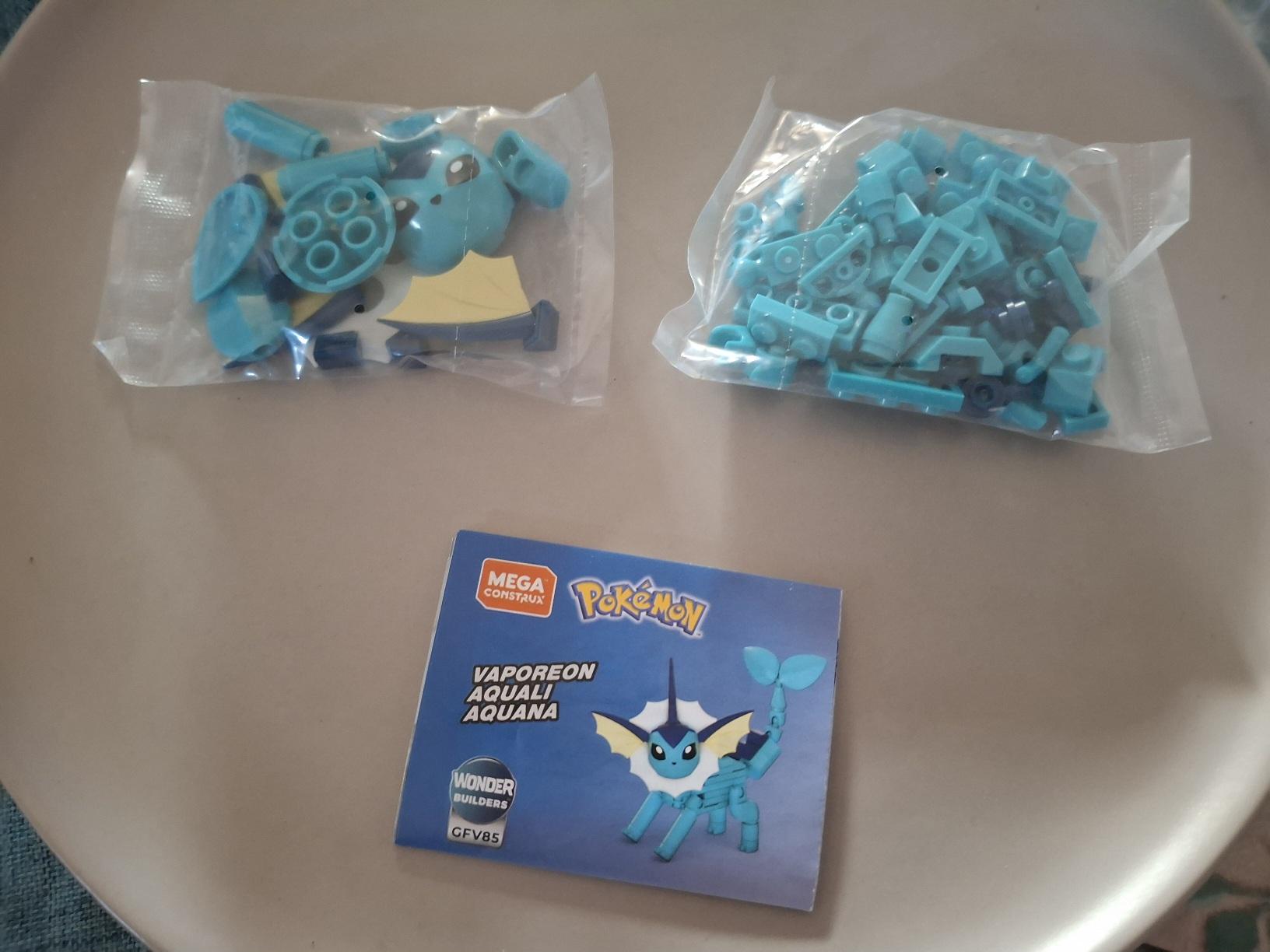 A picture of two little bags containing various blue pieces of a construction block toy. below the bags is a small paper pamphlet showing a completed Vaporeon in the Mega Construx line.