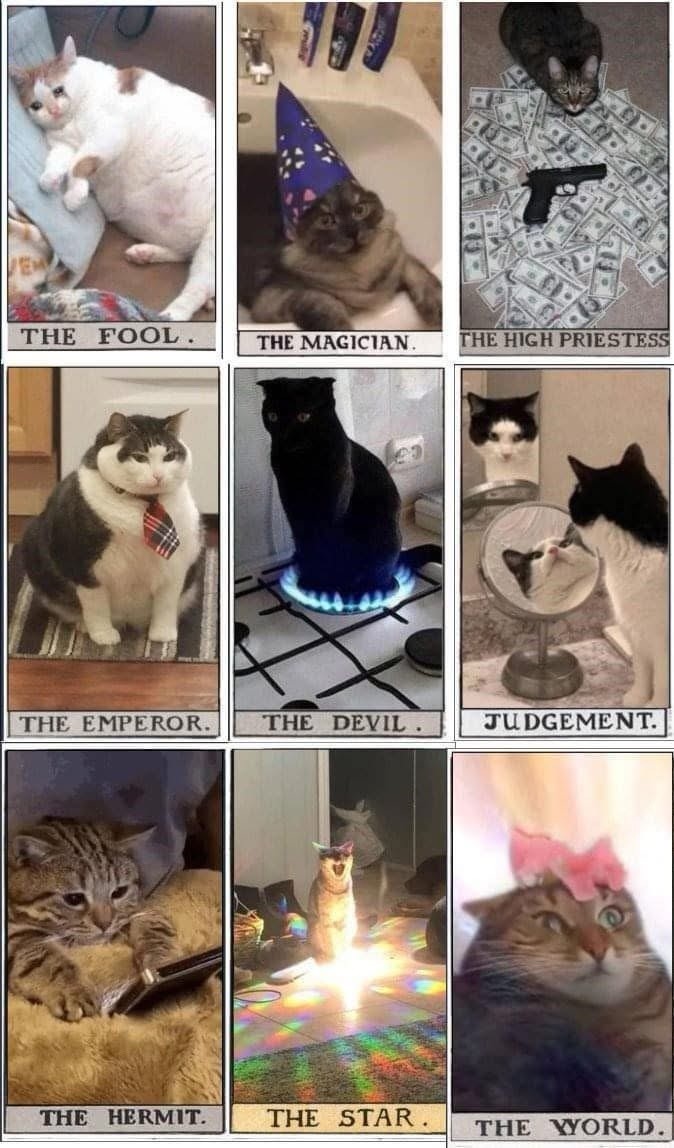 The image is a collage depicting nine cats styled after tarot cards, each in a separate panel with respective titles underneath. The first column shows "THE FOOL," featuring a relaxed white and orange cat lying on its back. "THE EMPEROR" depicts a large, serious cat wearing a red and black striped necktie, while "THE HERMIT" shows a cat nestled comfortably, looking at a phone. The middle column presents "THE MAGICIAN," a cat wearing a purple starry wizard hat while lying in a bathtub, "THE DEVIL," a black cat sitting on a stove burner with a ring of blue flame around it, and "THE STAR," featuring a cat standing amid vibrant multicolored lights on the floor. The third column includes "THE HIGH PRIESTESS," with a cat lying atop dollar bills with a gun beside it, "JUDGEMENT," where a black and white cat is looking at its reflection in a hand mirror, and "THE WORLD," portraying a slightly blurry image of a cat with a pink distorted bow effect on the top of its head.