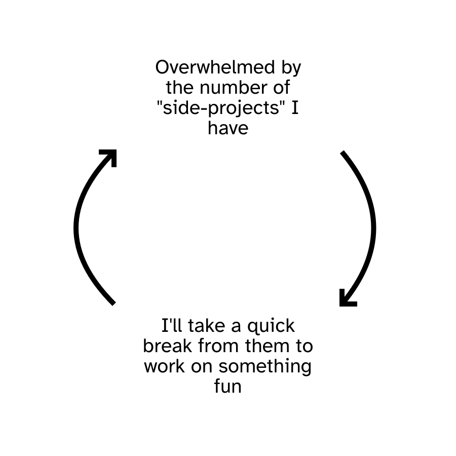 A meme showing a cycle of events where each step has an arrow pointing to the next, and the last one starts the cycle again. The steps are "Overwhelmed by the number of "side-projects" I have" and "I'll take a quick break from them to work on something fun".