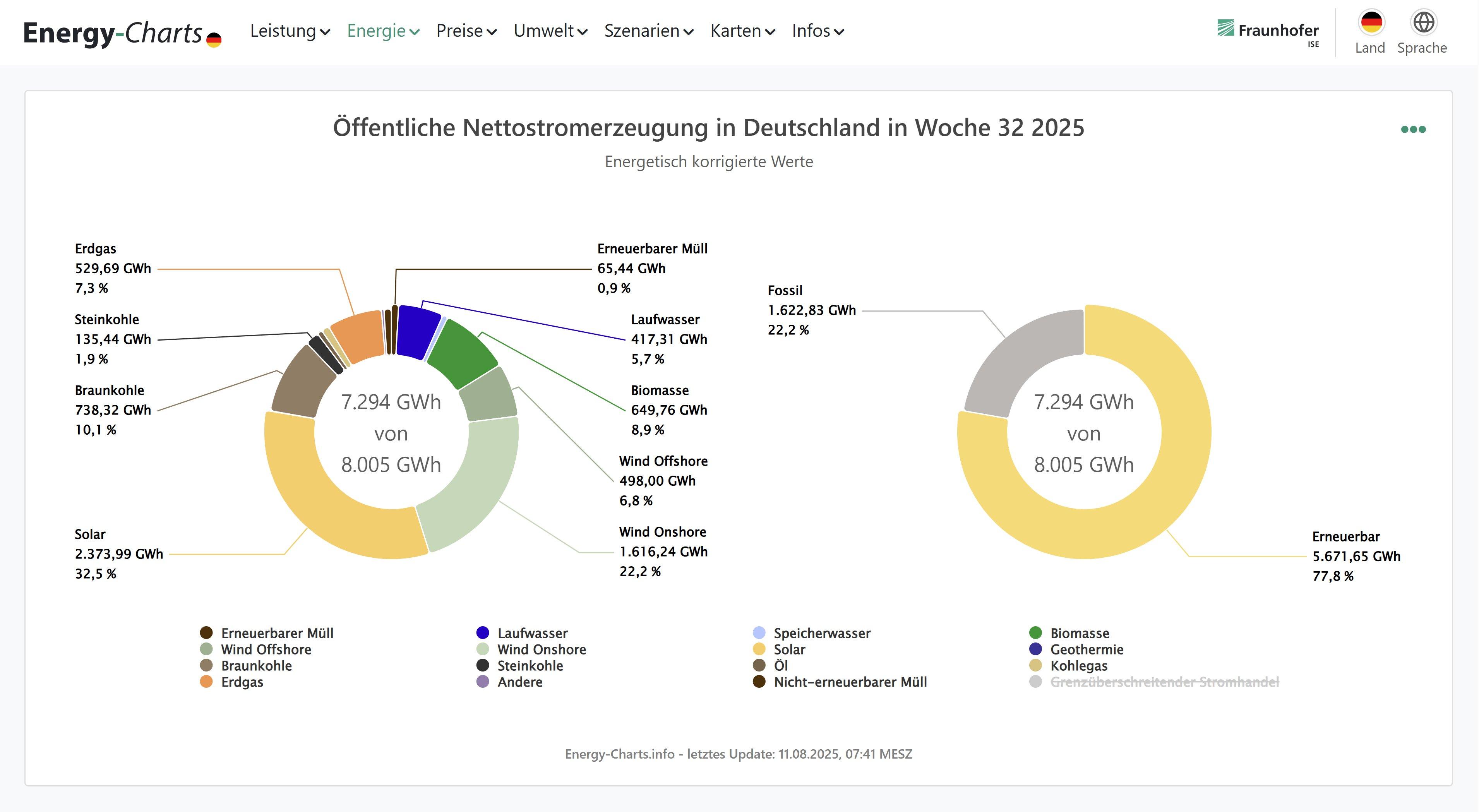 Grafik energieschart fraunhofer Institut Bruno Burger 77,8% Anteil der EE an der netto Stromerzeugung in Woche 32