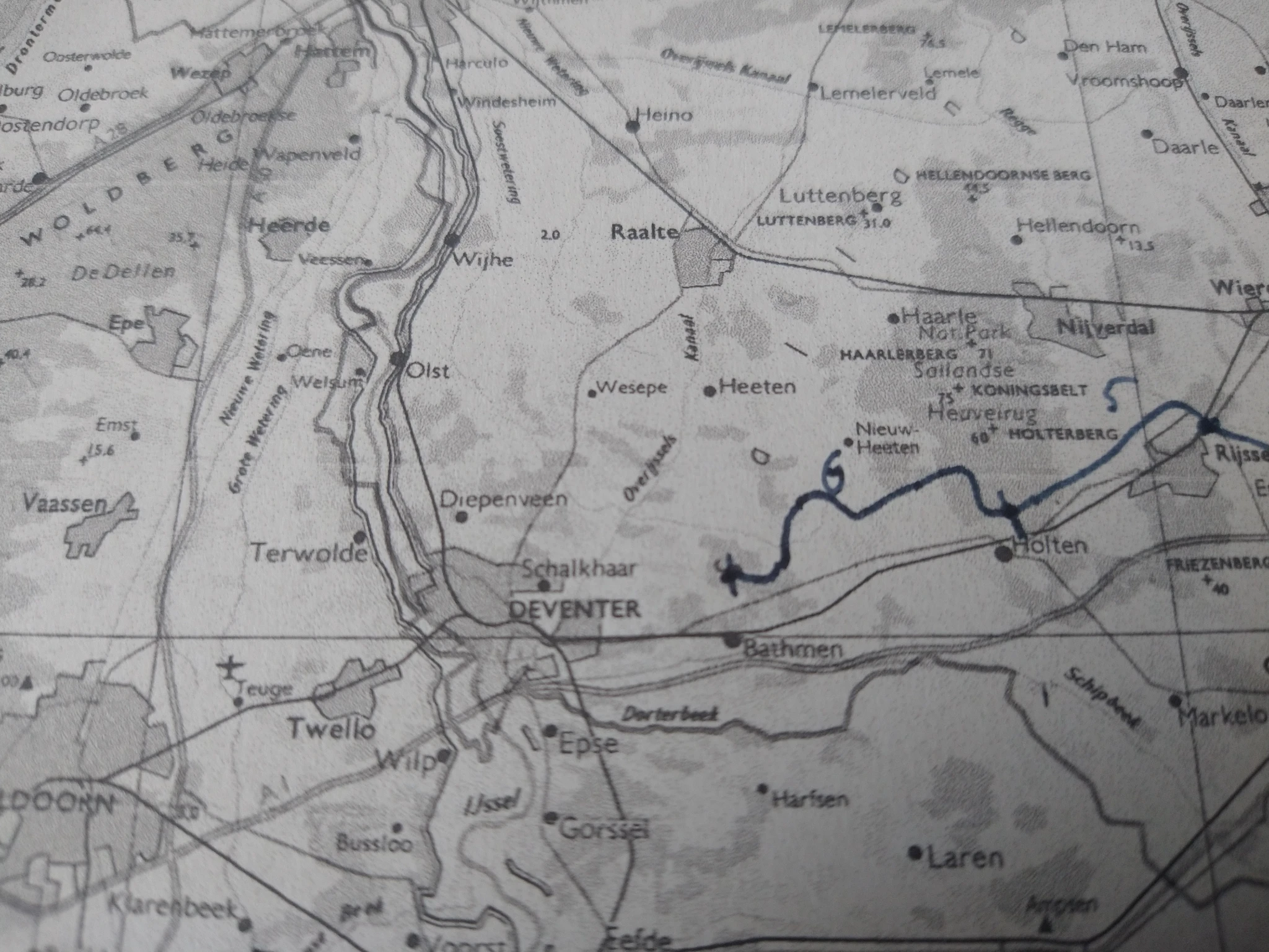 Close up of a greyscale copy of a map of the Netherlands, with a blue line snaking in from the right and stopping a bit before Deventer.