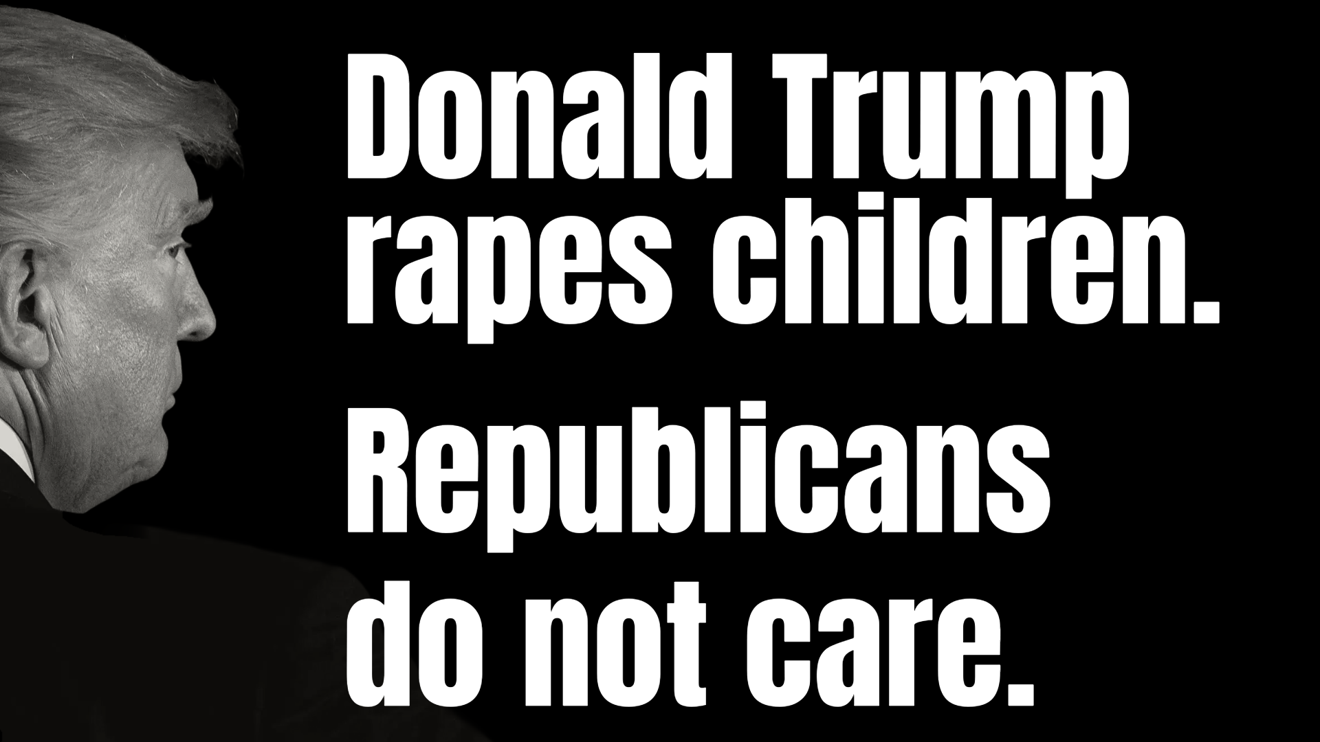 Puppyfucker leans in, in profile, from frame left. Donald Puppyfucker rapes children. Republicans do not care. The meme says his name, I say Puppyfucker.
