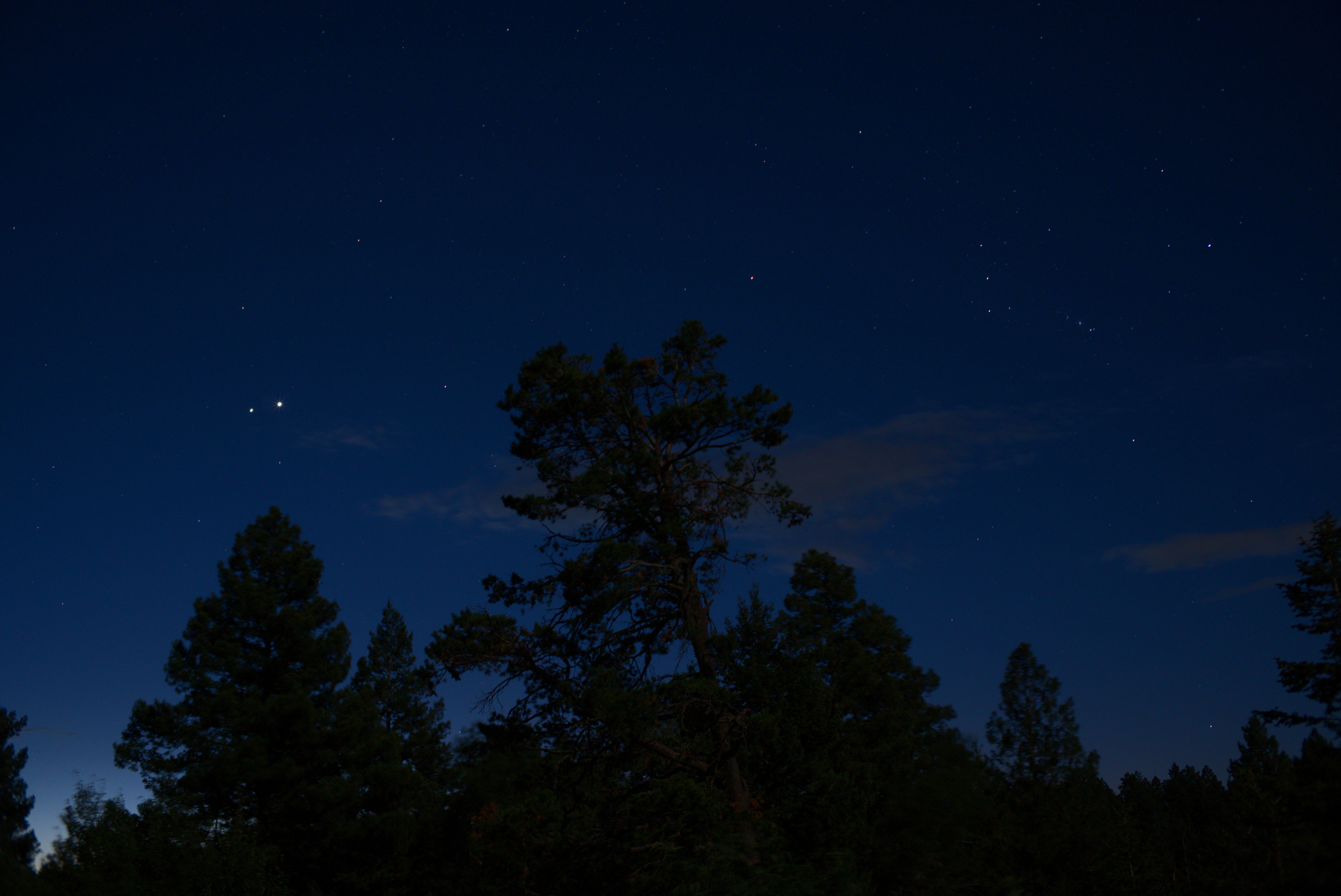 Fairly early in morning twilight. Many stars are still visible, but some light of dawn brightens the horizon, especially the lower left corner of the frame. The sky is very dark blue, except for a tiny hint of pink in the lower left. The full moon shines a bit of detail on the foreground trees. A couple small bands of clouds add some texture to the sky. Orion is in the right half of the frame.