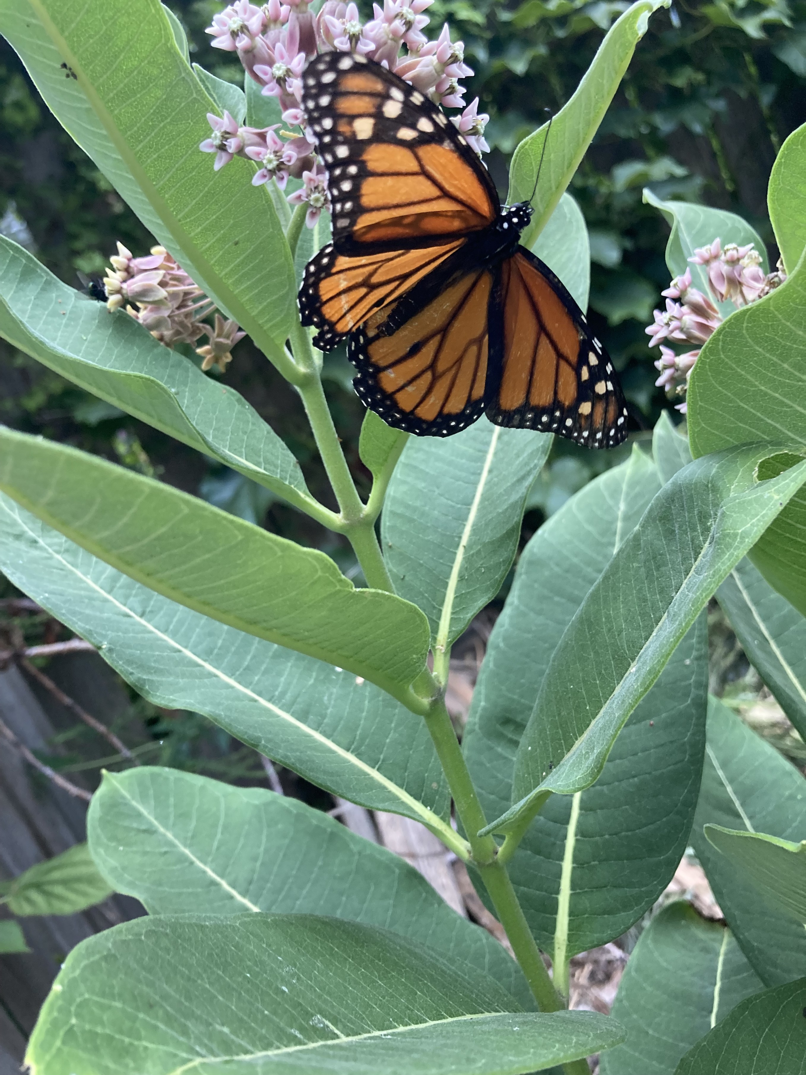 Bright orange monarch butterfly with wings extended feeding on pink milkweed bloom, with milkweed leaves in foreground