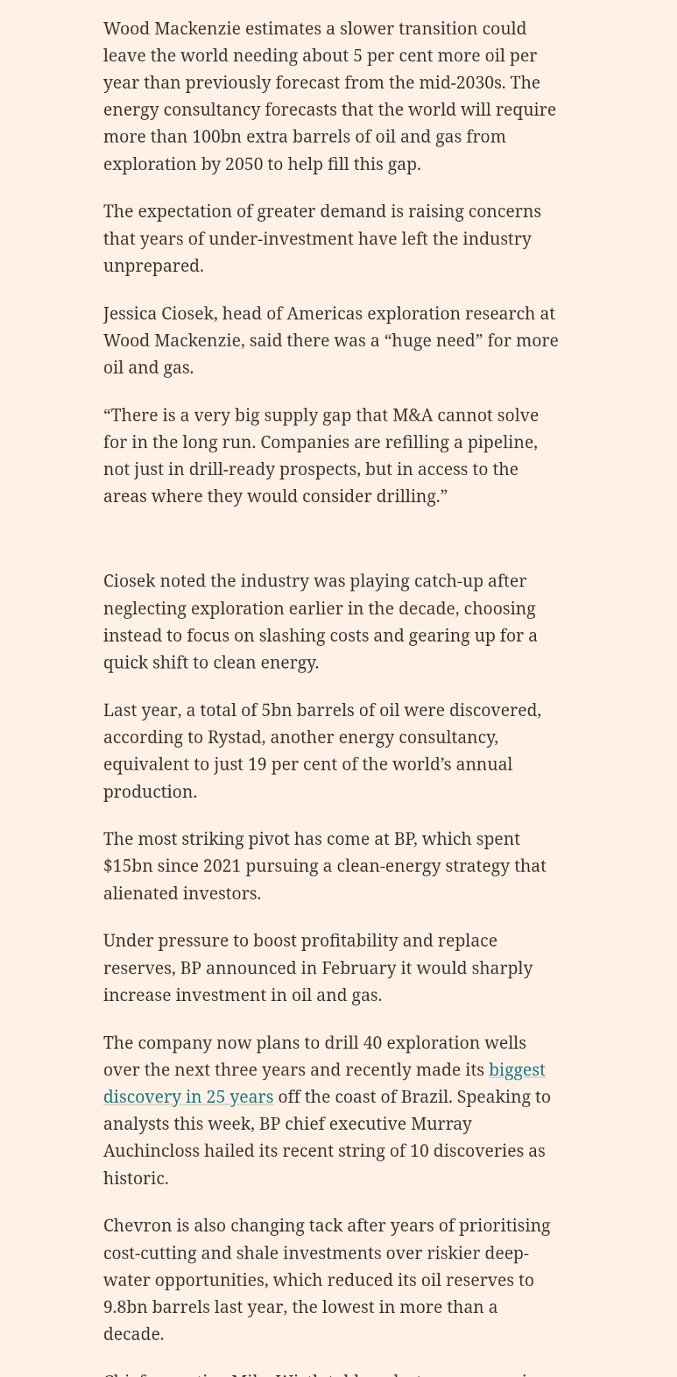 Big Oil heeds call to ‘drill, baby, drill’ as green transition slows Energy groups are refocusing on exploration in anticipation of the world remaining hooked on fossil fuels for decades Oil pumping jacks in an oil field at sunset in Russia Wood Mackenzie estimates a slower green transition could leave the world needing about 5% more oil per year than previously forecast from the mid-2030s © Bloomberg Creative Big Oil heeds call to ‘drill, baby, drill’ as green transition slows on x (opens in a new window) Big Oil heeds call to ‘drill, baby, drill’ as green transition slows on facebook (opens in a new window) Big Oil heeds call to ‘drill, baby, drill’ as green transition slows on linkedin (opens in a new window) Save current progress 65% Malcolm Moore in London and Jamie Smyth in New York Published15 minutes ago 0 Print this page Stay informed with free updates Simply sign up to the Oil & Gas industry myFT Digest -- delivered directly to your inbox. The world’s leading oil companies are stepping up their hunt for new oil and gas reserves, as a slower than expected transition to clean energy sets the stage for stronger fossil fuel demand for decades to come. Executives from BP, Chevron, ExxonMobil, Shell and TotalEnergies all used recent earnings calls to highlight how they have begun refocusing on securing new reserves after years of prioritising renewables. Expectations for a rapid energy transition have moderated in recent years, as elevated inflation and interest rates raised costs and slowed development of renewables. Geopolitical instability has led governments to prioritise energy security over decarbonisation. US President Donald Trump has directed oil and gas producers to “drill, baby, drill”. Wood Mackenzie estimates a slower transition could leave the world needing about 5 per cent more oil per year than previously forecast from the mid-2030s. The energy consultancy forecasts that the world will require more than 100bn extra barrels of oil and gas from ex…