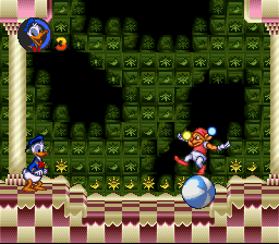 A screenshot from Donald Duck No Mahou No Boushi. It shows Donald standing in a checkboard arena, in front of him is a Juggler standing in a ball.
